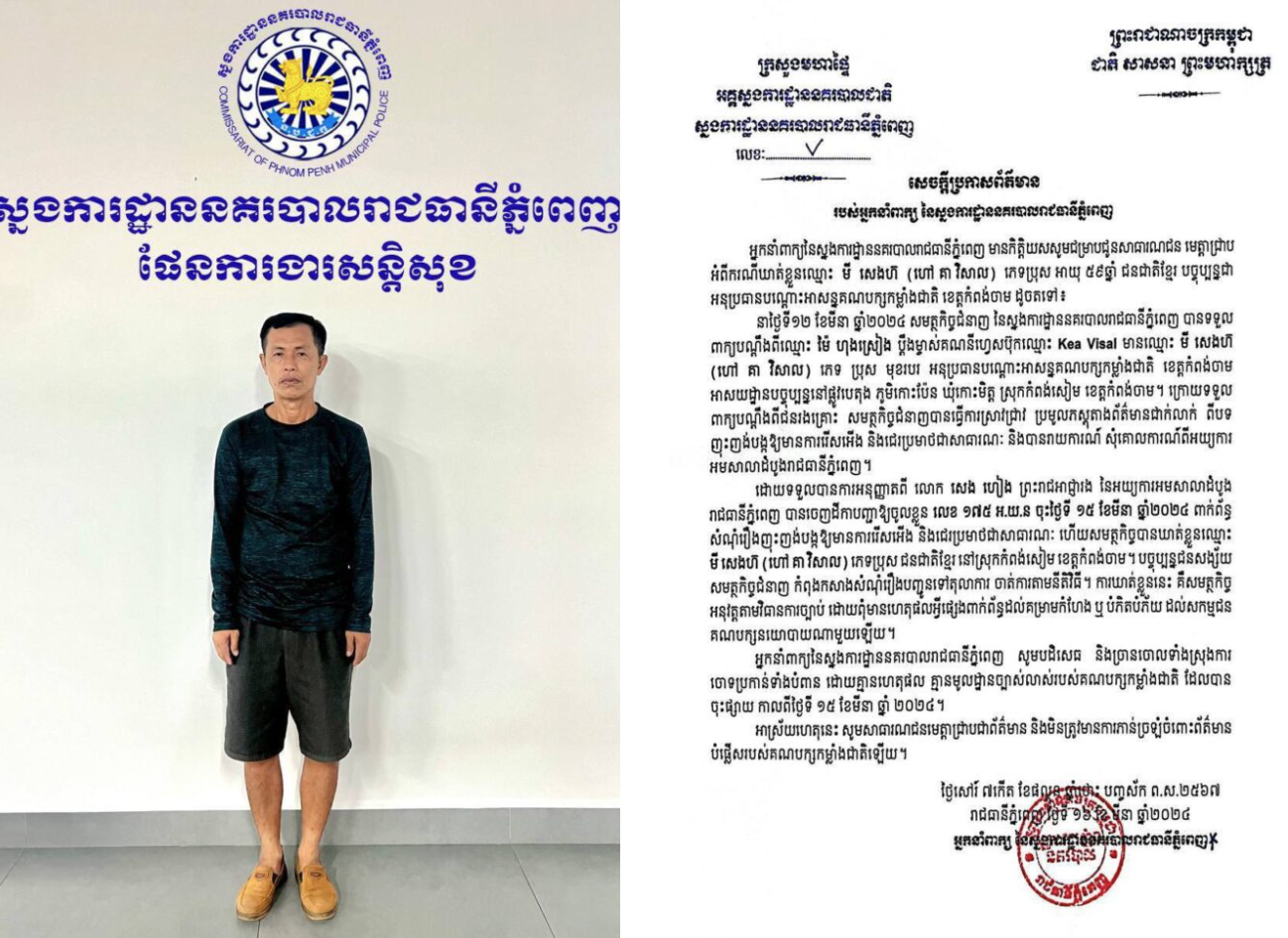 ដោយទទួលបានការអនុញ្ញាតពី លោក សេង ហៀង ព្រះរាជអាជ្ញារង នៃអយ្យការអមសាលាដំបូងរាជធានីភ្នំពេញ បានចេញដីកាបញ្ជាឱ្យចូលខ្លួន លេខ ១៧៥ អ.យ.ន ចុះថ្ងៃទី ១៥ ខែមីនា ឆ្នាំ២០២៤ ពាក់ព័ន្ធសំណុំរឿងញុះញង់បង្កឱ្យមានការរើសអើង និងជេរប្រមាថជាសាធារណៈ ហើយសមត្ថកិច្ចបានឃាត់ខ្លួនឈ្មោះ មី សេងហ៊ (ហៅ គា វិសាល) ភេទប្រុស ជនជាតិខ្មែរ នៅស្រុកកំពង់សៀម ខេត្តកំពង់ចាម។ បច្ចុប្បន្នជនសង្ស័យ សមត្ថកិច្ចជំនាញ កំពុងកសាងសំណុំរឿងបញ្ជូនទៅតុលាការ ចាត់ការតាមនីតិវិធី។ ការឃាត់ខ្លួននេះ គឺសមត្ថកិច្ច អនុវត្តតាមវិធានការច្បាប់ ដោយពុំមានហេតុផលអ្វីផ្សេងពាក់ព័ន្ធដល់គំរាមកំហែង ឬ បំភិតបំភ័យដល់សកម្មជនគណបក្សនយោបាយណាមួយឡើយ។