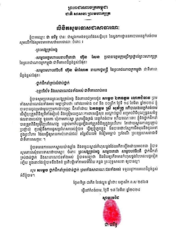 លោកឧត្តមសេនីយ៍ត្រី ជា ធារឹទ្ធ ស្នងការរងទទួលផែនការងារសន្តិសុខ នៃស្នងការដ្ឋាននគរបាលខេត្តកំពង់ចាម ធ្វើលិខិតសូមទោសជាសាធារណៈចំពោះព្រះសង្ឃគ្រប់ព្រះអង្គ សម្តេចតេជោ ហ៊ុន សែន ប្រធានក្រុមឧត្តមប្រឹក្សាផ្ទាល់ព្រះមហាក្សត្រ សម្តេច ហ៊ុន ម៉ាណែត នាយករដ្ឋមន្រ្តីនៃកម្ពុជា និងថ្នាក់ដឹកនាំគ្រប់លំដាប់ថ្នាក់ ជុំវិញករណីពាក់ស្បែកជើងចូលព្រះវិហារ ៕