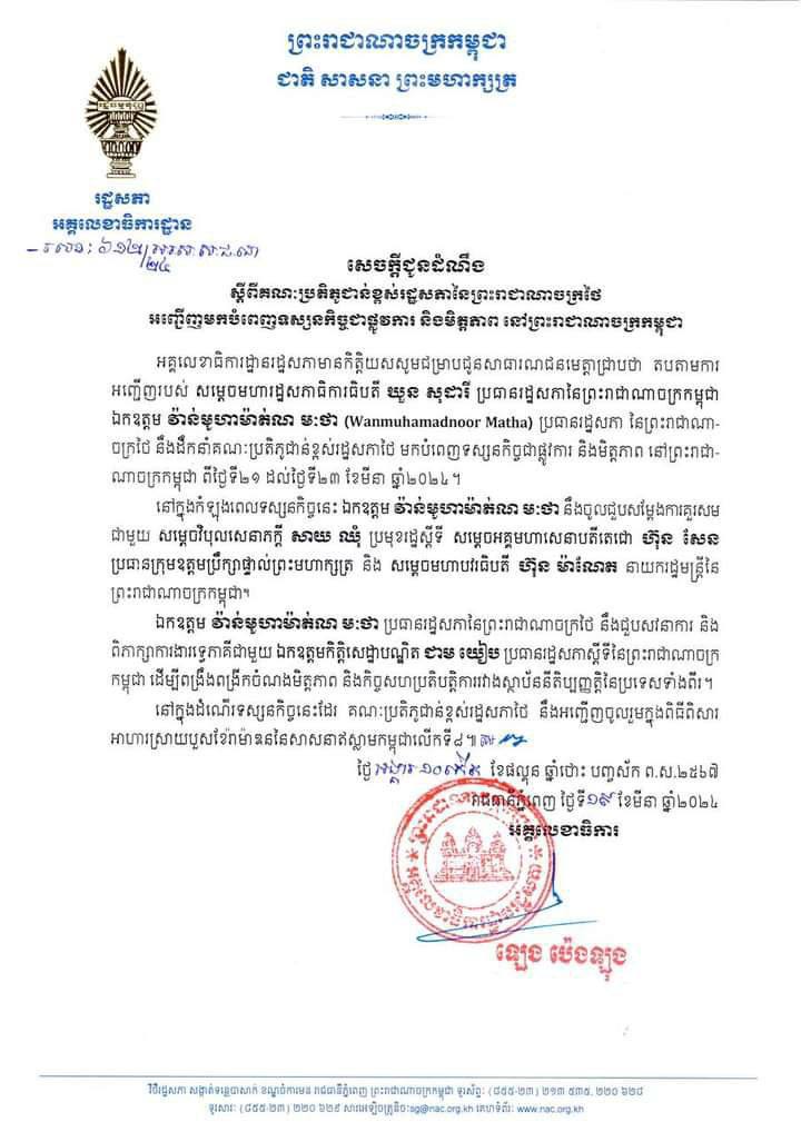 អគ្គលេខាធិការដ្ឋានរដ្ឋសភាបានឲ្យដឹងថា តបតាមការអញ្ជើញរបស់សម្តេចមហារដ្ឋសភាធិការធិបតី ឃួន សុដារី ប្រធានរដ្ឋសភានៃព្រះរាជាណាចក្រកម្ពុជា ឯកឧត្តម វ៉ាន់មូហាម៉ាត់ណ មៈថា (Wanmuhamadnoor Matha) ប្រធានរដ្ឋសភា នៃព្រះរាជាណាចក្រថៃ នឹងដឹកនាំគណៈប្រតិភូជាន់ខ្ពស់រដ្ឋសភាថៃ មកបំពេញទស្សនកិច្ចជាផ្លូវការ និងមិត្តភាព នៅព្រះរាជាណាចក្រកម្ពុជា ពីថ្ងៃទី២១ ដល់ថ្ងៃទី២៣ ខែមីនា ឆ្នាំ២០២៤។