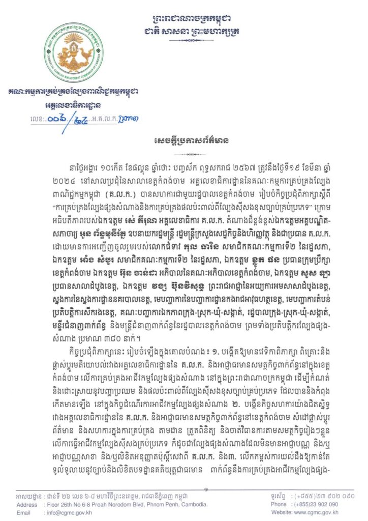 (កំពង់ចាម)៖ នាថ្ងៃទី១៩ ខែមីនា ឆ្នាំ ២០២៤ នៅសាលប្រជុំនៃសាលាខេត្តកំពង់ចាម អគ្គលេខាធិការដ្ឋាននៃគណៈកម្មការគ្រប់គ្រងល្បែង ពាណិជ្ជកម្មកម្ពុជា (គល.ក.) បានសហការជាមួយរដ្ឋបាលខេត្តកំពង់ចាម រៀបចំកិច្ចប្រជុំពិភាក្សាស្តីពី “ការគ្រប់គ្រងល្បែងផ្សងសំណាងនិងការគ្រប់គ្រងផលប៉ះពាល់ពីល្បែងស៊ីសងខុសច្បាប់គ្រប់ប្រភេទ” ក្រោម អធិបតីភាពរបស់ឯកឧត្តម រស់ ភីរុណ អគ្គលេខាធិការ គ.ល.ក. តំណាងដ៏ខ្ពង់ខ្ពស់ឯកឧត្តមអគ្គបណ្ឌិត សភាចារ្យ អូន ព័ន្ធមុនីរ័ត្ន ឧបនាយករដ្ឋមន្ត្រី រដ្ឋមន្ត្រីក្រសួងសេដ្ឋកិច្ចនិងហិរញ្ញវត្ថុ និងជាប្រធាន គ.ល.ក. ដោយមានការអញ្ជើញចូលរួម ប្រមាណ ៣៨០នាក់។