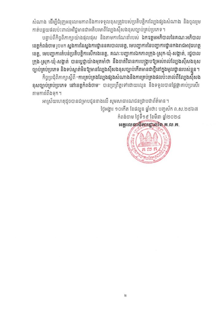 ២. បង្កើនកិច្ចសហការយ៉ាងជិតស្និទ្ធ រវាងអគ្គលេខាធិការដ្ឋាននៃ គ.ល.កនិងអាជ្ញាធរមានសមត្ថកិច្ចពាក់ព័ន្ធនៅខេត្តកំពង់ចាម សំដៅផ្លាស់ប្តូរ ព័ត៌មាន និងសហការក្នុងការគ្រប់គ្រង តាមដាន ត្រួតពិនិត្យ និងចាត់វិធានការតាមសមត្ថកិច្ចរៀងៗខ្លួន លើការធ្វើអាជីវកម្មល្បែងស៊ីសងគ្រប់ប្រភេទ ក៏ដូចជាល្បែងផ្សងសំណាងដែលមិនមានអាជ្ញាបណ្ណ និង/ឬ អាជ្ញាបណ្ណសាខា និង/ឬលិខិតអនុញ្ញាតប៉ុស្តិ៍សេវាពី គ.ល.ក ។
