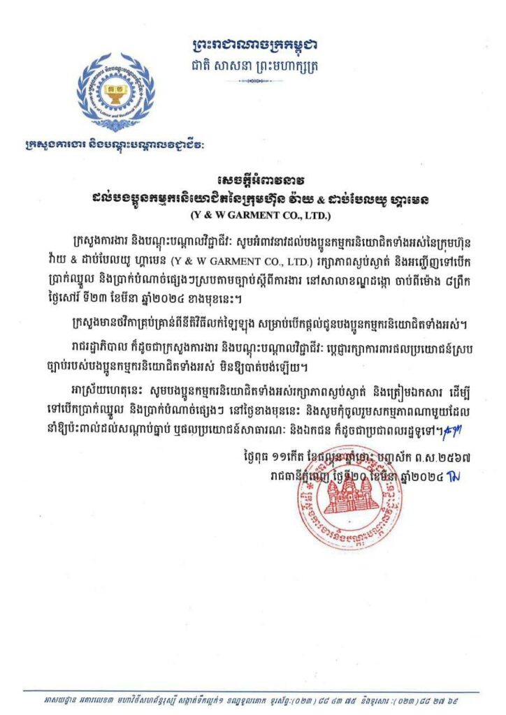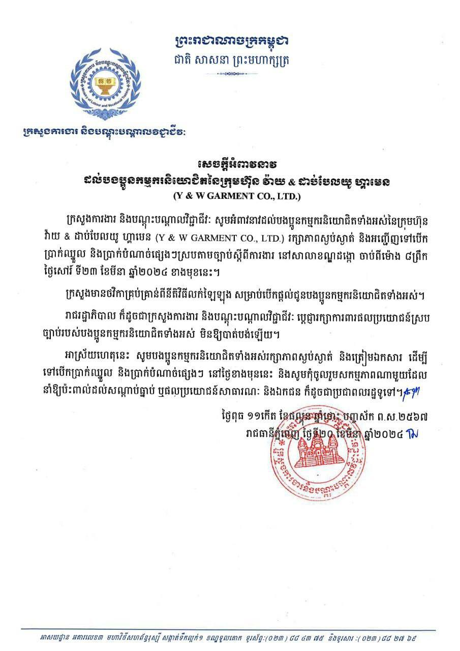 ក្រសួងការងារ អំពាវនាវដល់កម្មករនិយោជិតនៃក្រុមហ៊ុន Y & W រក្សាភាពស្ងប់ស្ងាត់ និងអញ្ជើញទៅបើកប្រាក់ឈ្នួល និងប្រាក់បំណាច់ ផ្សេងៗ នៅសាលាខណ្ឌដង្កោ នាថ្ងៃទី២៣ ខែមីនា