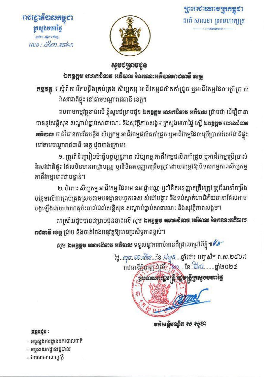 ២.ចំពោះ សិប្បកម្ម អាជីវកម្ម ដែលមានអាជ្ញាបណ្ណ ឬលិខិតអនុញ្ញាតត្រឹមត្រូវ ត្រូវណែនាំពង្រឹង បន្ថែមលើការគ្រប់គ្រងស្របតាមបទដ្ឋានបច្ចេកទេស សំដៅបង្ការ និងទប់ស្កាត់ហានិភ័យនានាដែលអាច បង្កឡើងជាយថាហេតុប៉ះពាល់ដល់សន្តិសុខ សណ្តាប់ធ្នាប់សាធារណៈ និងសុវត្ថិភាពសង្គម៕