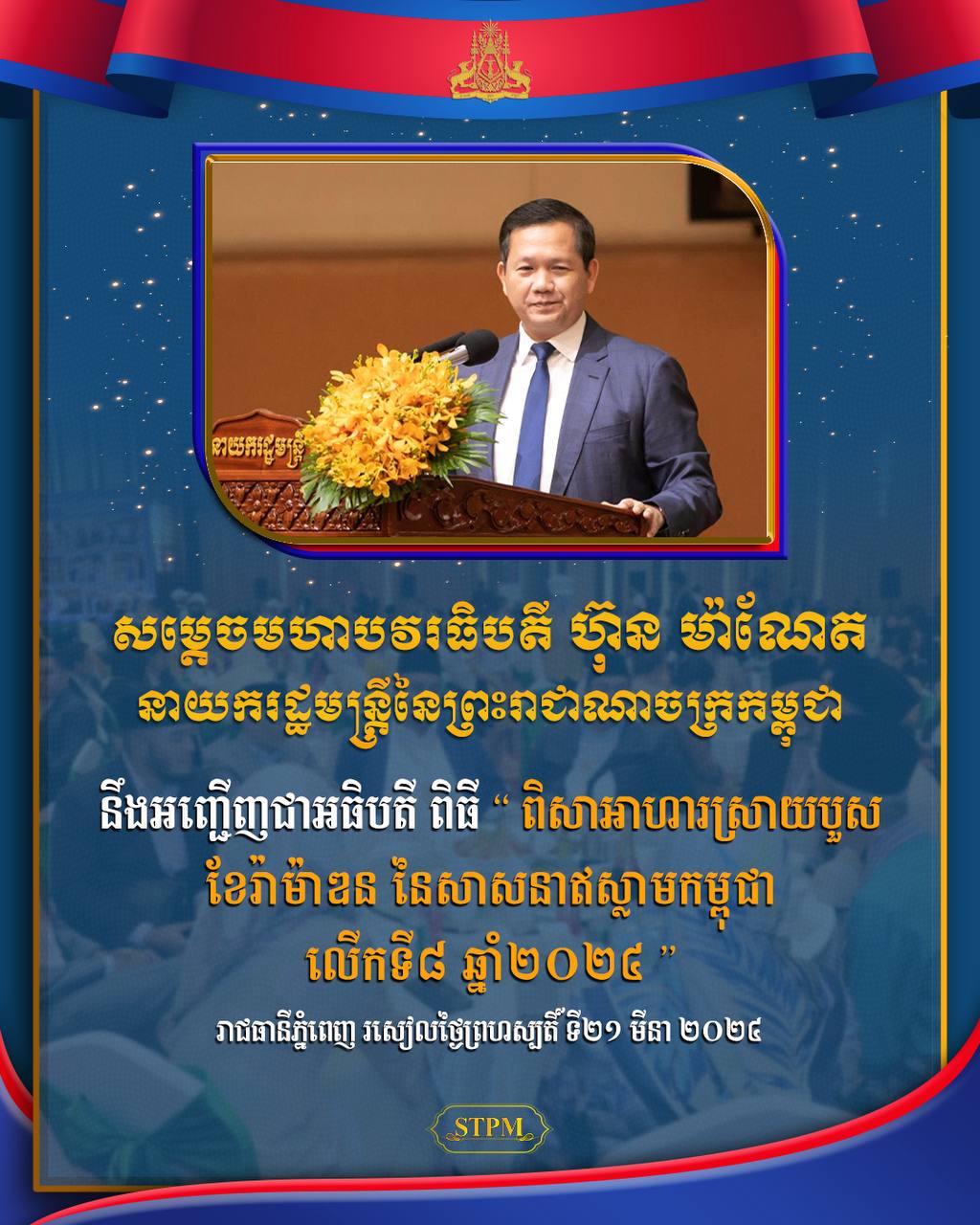 ល្ងាចនេះ សម្តេចធិបតី ហ៊ុន ម៉ាណែត អញ្ជើញជាអធិបតី ក្នុងពិធីពិសាអាហារ ស្រាយបួសខែរ៉ាម៉ាឌន នៃសាសនាអ៊ិស្លាមកម្ពុជា លើកទី៨