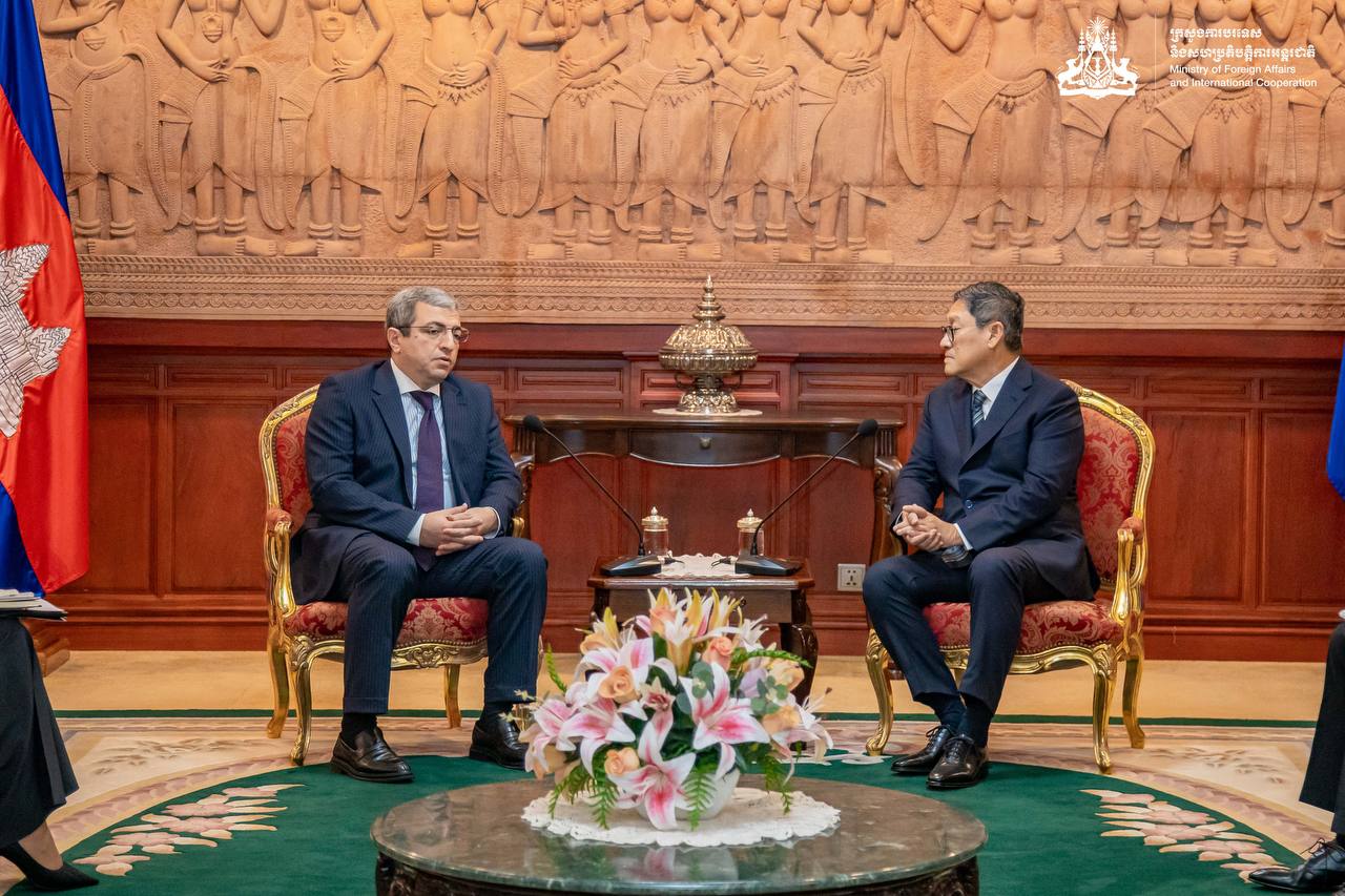 ភ្នំពេញ៖ ឯកឧត្តម សុខ ចិន្តាសោភា ឧបនាយករដ្ឋមន្ត្រី និងជារដ្ឋមន្ត្រីការបរទេស និងសហប្រតិបត្តិការអន្តរជាតិ បានអនុញ្ញាតជូន ឯកឧត្តម Shovgi Mehdizada ឯកអគ្គរដ្ឋទូតវិសាមញ្ញ និងពេញសមត្ថភាព នៃសាធារណរដ្ឋអាស៊ែបៃហ្សង់ ប្រចាំព្រះរាជាណាចក្រកម្ពុជា ដែលមាននិវេសនដ្ឋាននៅទីក្រុងហាណូយ ចូលជួបសម្ដែងការគួរសម និងពិភាក្សាការងារ នៅទីស្តីការក្រសួង នៅថ្ងៃទី២១ ខែមីនា ឆ្នាំ២០២៤ ។