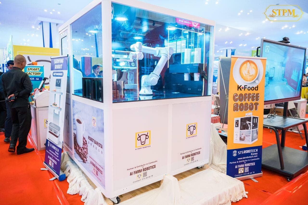 មនុស្សយន្តនេះត្រូវគ្រប់គ្រងដោយប្រព័ន្ធបញ្ជាបញ្ញាសិប្បនិម្មិត ឬ AI។ វាមានឈ្មោះថា Café Robot។ វាប្រើដៃយន្តមួយចំហៀងដែលមានសមត្ថភាពឆុងកាហ្វេមួយកែវ មិនដល់មួយនាទីផង។ នេះជាផលិតផលរបស់ក្រុមហ៊ុន STS Robotech របស់ប្រទេសកូរ៉េខាងត្បូង និងត្រូវបាននាំចូលដោយក្រុមហ៊ុន AI Farm ក្នុងគោលបំណងដាក់បង្ហាញអំពីបច្ចេកវិទ្យាចុងក្រោយ ដែលពិភពលោកបានបង្កើតឡើង និងជំរុញឲ្យមានការរួមគ្នាសិក្សាស្រាវជ្រាវបន្ថែម។ នេះបើយោងតាមលោក ទេព សុវិជ្ជា ប្រធានក្រុមស្រាវជ្រាវ និងអភិវឌ្ឍន៍បច្ចេកវិទ្យារ៉ូបូតនៃក្រុមហ៊ុន AI Farm។ AI Farm ជាក្រុមហ៊ុនក្នុងស្រុកឈានមុខគេមួយក្នុងការបង្កើតផលិតផលបច្ចេកវិទ្យា។