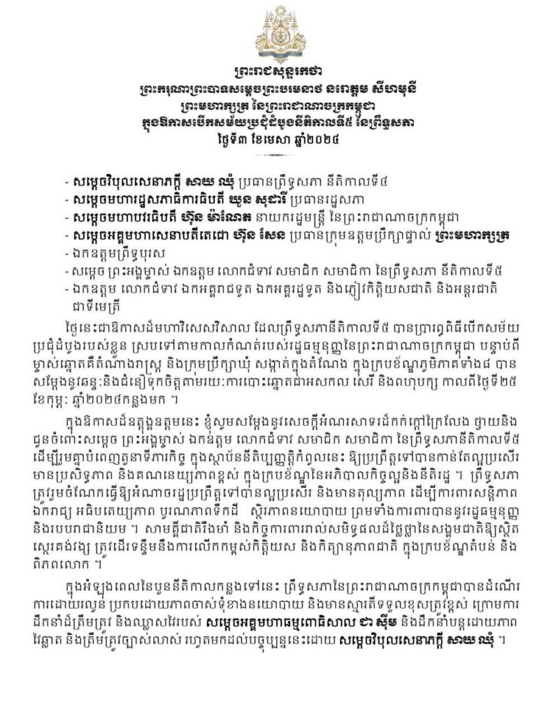 ព្រះមហាក្សត្រ បានមានព្រះរាជបន្ទូលថា ថ្ងៃនេះជាឱកាសដ៏មហាវិសេសវិសាល ដែលព្រឹទ្ធសភានីតិកាលទី៥ បានប្រារព្ធពិធីបើកសម័យ ប្រជុំដំបូងរបស់ខ្លួន ស្របទៅតាមកាលកំណត់របស់រដ្ឋធម្មនុញ្ញនៃព្រះរាជាណាចក្រកម្ពុជា បន្ទាប់ពីម្ចាស់ឆ្នោតគឺតំណាងរាស្ត្រ និងក្រុមប្រឹក្សាឃុំ សង្កាត់ក្នុងតំណែង ក្នុងក្របខ័ណ្ឌភូមិភាគទាំង៨ បានសម្តែងនូវឆន្ទៈនិងជំនឿទុកចិត្តតាមរយៈការបោះឆ្នោតជាអសកល សេរី និងពហុបក្ស កាលពីថ្ងៃទី២៥ ខែកុម្ភៈ ឆ្នាំ២០២៤កន្លងមក។