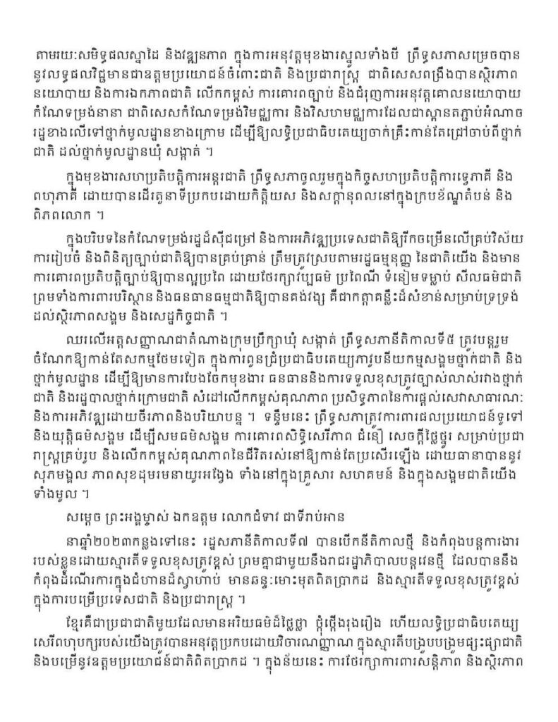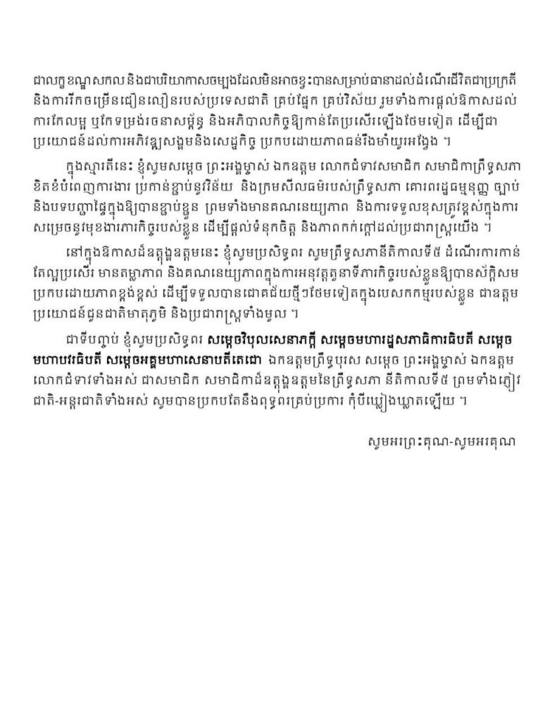 ក្នុងឱកាសដ៏ឧត្តុង្គឧត្តមនេះ ព្រះមហាក្សត្រ សូមសម្តែងនូវសេចក្តីអំណរសាទរដ៏កក់ក្តៅក្រៃលែង ថ្វាយ និងជូនចំពោះសម្តេច ព្រះអង្គម្ចាស់ ឯកឧត្តម លោកជំទាវ សមាជិក សមាជិកា នៃព្រឹទ្ធសភានីតិកាលទី៥ ដើម្បីរួមគ្នាបំពេញតួនាទីភារកិច្ច ក្នុងស្ថាប័ននីតិប្បញ្ញត្តិកំពូលនេះ ឱ្យប្រព្រឹត្តទៅបានកាន់តែល្អប្រសើរ មានប្រសិទ្ធភាព និងគណនេយ្យភាពខ្ពស់ ក្នុងក្របខ័ណ្ឌនៃអភិបាលកិច្ចល្អនិងនីតិរដ្ឋ។ ព្រឹទ្ធសភា ត្រូវរួមចំណែកធ្វើឱ្យអំណាចរដ្ឋប្រព្រឹត្តទៅបានល្អប្រសើរ និងមានតុល្យភាព ដើម្បីការពារសន្តិភាព ឯករាជ្យ អធិបតេយ្យភាព បូរណភាពទឹកដី ស្ថិរភាពនយោបាយ ព្រមទាំងការពារបាននូវរដ្ឋធម្មនុញ្ញ និងរបបរាជានិយម។ សាមគ្គីជាតិរឹងមាំ និងកិច្ចការពាររាល់សមិទ្ធផលដ៏ថ្លៃថ្លានៃសង្គមជាតិឱ្យស្ថិត ស្ថេរគង់វង្ស ត្រូវដើរទន្ទឹមនឹងការលើកកម្ពស់កិត្តិយស និងកិត្យានុភាពជាតិ ក្នុងក្របខ័ណ្ឌតំបន់ និងពិភពលោក។