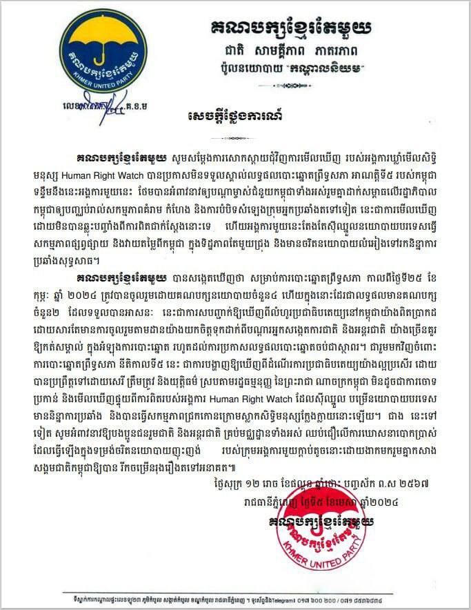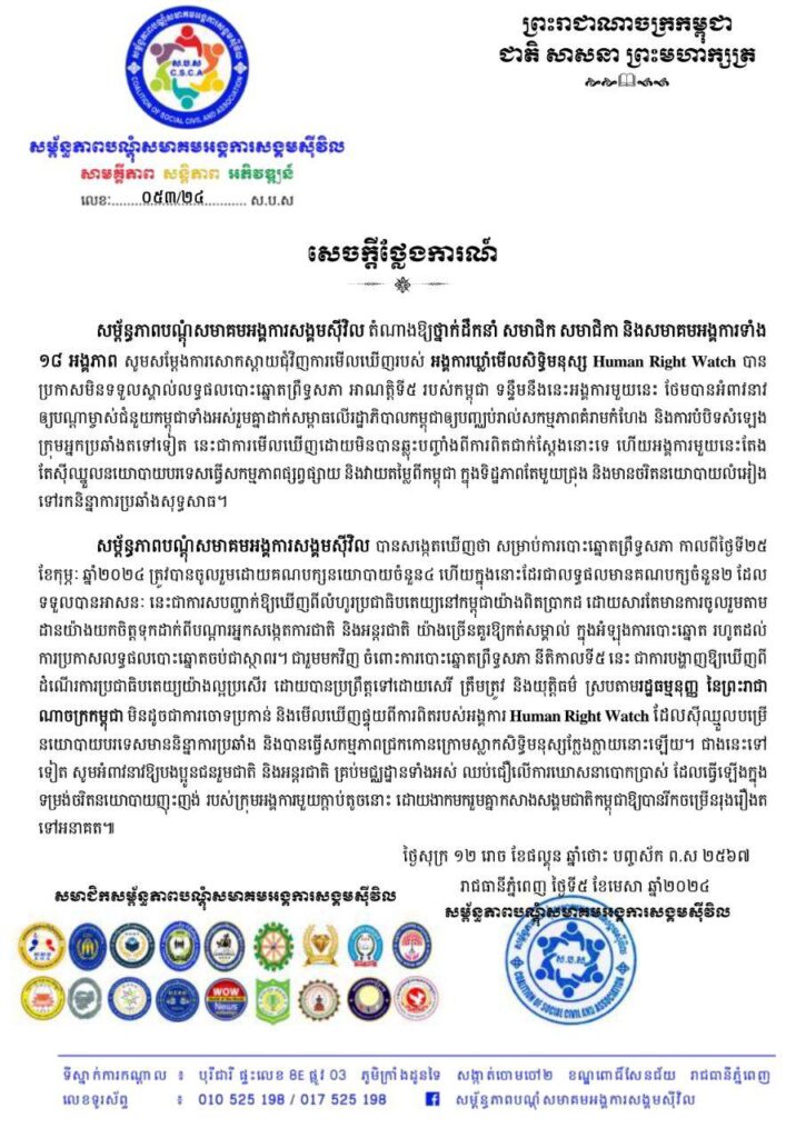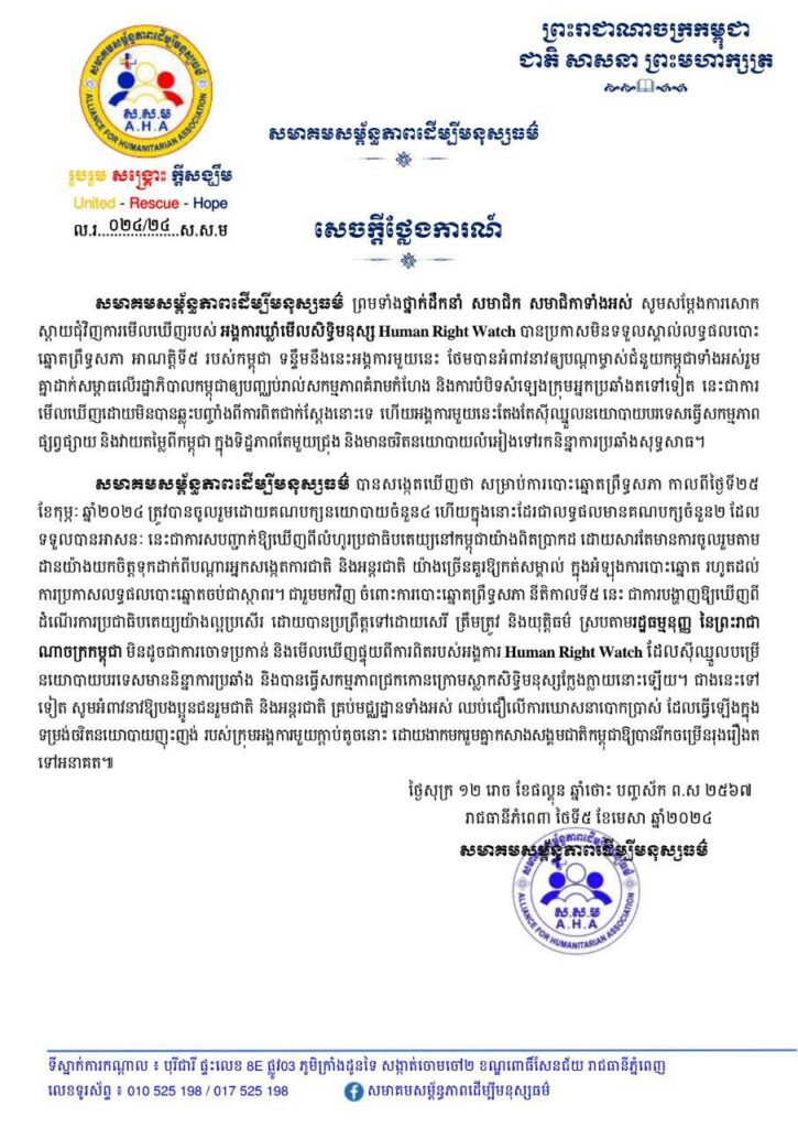 គណបក្សនយោបាយ សម្ព័ន្ធភាពបណ្តុំសមាគមអង្គការសង្គមស៊ីវិល និងសមាគមសម្ព័ន្ធភាពដើម្បីមនុស្សធម៌ បានសង្កេតឃើញថា សម្រាប់ការបោះឆ្នោតព្រឹទ្ធសភាកាលពីថ្ងៃទី២៥ ខែកុម្ភៈ ឆ្នាំ២០២៤ ត្រូវបានចូលរួមដោយគណបក្សនយោបាយចំនួន៤ ហើយក្នុងនោះដែរជាលទ្ធផលមានគណបក្សចំនួន២ ដែលទទួលបានអាសនៈ នេះជាការសបញ្ជាក់ឱ្យឃើញពីលំហូរប្រជាធិបតេយ្យនៅកម្ពុជាយ៉ាងពិតប្រាកដ ដោយសារតែមានការចូលរួមតាមដានយ៉ាងយកចិត្តទុកដាក់ពីបណ្តារអ្នកសង្កេតការណ៍ជាតិ និងអន្តរជាតិ យ៉ាងច្រើនគួរឱ្យកត់សម្គាល់ ក្នុងអំឡុងការបោះឆ្នោត រហូតដល់ការប្រកាសលទ្ធផលបោះឆ្នោតចប់ជាស្ថាពរ។ ជារួមមកវិញ ចំពោះការបោះឆ្នោតព្រឹទ្ធសភា នីតិកាលទី៥នេះ ជាការបង្ហាញឱ្យឃើញពីដំណើរការប្រជាធិបតេយ្យយ៉ាងល្អប្រសើរ ដោយបានប្រព្រឹត្តទៅដោយសេរី ត្រឹមត្រូវ និងយុត្តិធម៌ ស្របតាមរដ្ឋធម្មនុញ្ញ នៃព្រះរាជាណាចក្រកម្ពុជា មិនដូចជាការចោទប្រកាន់ និងមើលឃើញផ្ទុយពីការពិតរបស់អង្គការ Human Right Watch ដែលស៊ីឈ្មួលបម្រើនយោបាយបរទេសមាននិន្នាការប្រឆាំង និងបានធ្វើសកម្មភាពជ្រកកោនក្រោមស្លាកសិទ្ធិមនុស្សក្លែងក្លាយនោះឡើយ។ ជាមួយគ្នានេះ គណបក្សនយោបាយ សម្ព័ន្ធភាពបណ្តុំសមាគមអង្គការសង្គមស៊ីវិល និងសមាគមសម្ព័ន្ធភាពដើម្បីមនុស្សធម៌ បានអំពាវនាវឱ្យបងប្អូនជនរួមជាតិ និងអន្តរជាតិ គ្រប់មជ្ឈដ្ឋានទាំងអស់ ឈប់ជឿលើការឃោសនាបោកប្រាស់ ដែលធ្វើឡើងក្នុងទម្រង់ចរិតនយោបាយញុះញង់ របស់ក្រុមអង្គការមួយក្តាប់តូចនោះ ដោយងាកមករួមគ្នាកសាងសង្គមជាតិកម្ពុជាឱ្យបានរីកចម្រើនរុងរឿងតទៅអនាគត៕