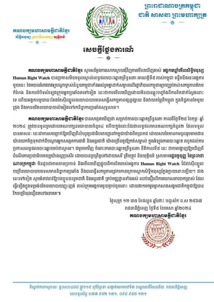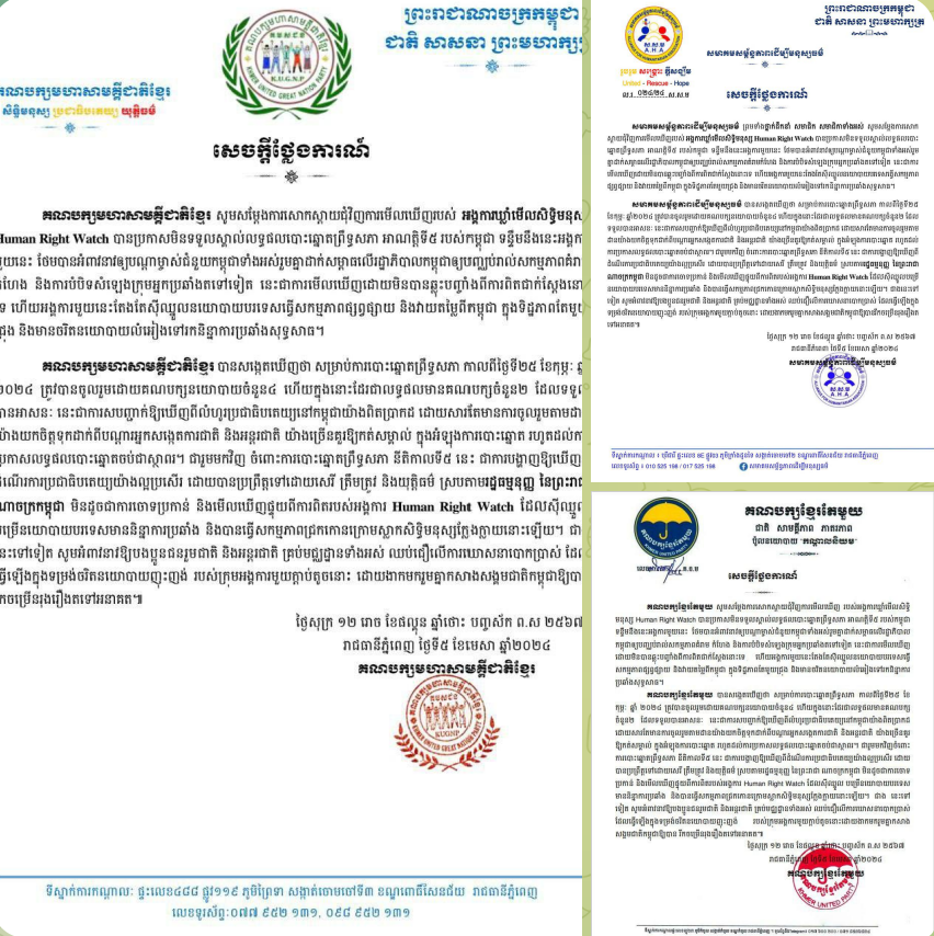 ភ្នំពេញ៖ គណបក្សនយោបាយ សម្ព័ន្ធភាព បណ្តុំសមាគមអង្គការសង្គមស៊ីវិល និងសមាគមសម្ព័ន្ធភាពដើម្បីមនុស្សធម៌ បានប្រតិកម្មតបទៅនឹងអង្គការឃ្លាំមើលសិទ្ធិមនុស្ស Human Right Watch ដែលបានប្រកាសមិនទទួលស្គាល់លទ្ធផលបោះឆ្នោតព្រឹទ្ធសភា អាណត្តិទី៥ របស់កម្ពុជា និងបានហៅអង្គការមួយនេះថា ស៊ីឈ្នួលនយោបាយបរទេសធ្វើសកម្មភាពផ្សព្វផ្សាយ និងវាយតម្លៃពីកម្ពុជា ក្នុងទិដ្ឋភាពតែមួយជ្រុង និងមានចរិតនយោបាយលំអៀងទៅរកនិន្នាការប្រឆាំងសុទ្ធសាធ និងស៊ីឈ្មួលបម្រើនយោបាយបរទេសមាននិន្នាការប្រឆាំង និងបានធ្វើសកម្មភាពជ្រកកោនក្រោមស្លាកសិទ្ធិមនុស្សក្លែងក្លាយ។ នេះបើយោងតាមសេចក្តីថ្លែងការណ៍នៅថ្ងៃទី៥ ខែមេសា ឆ្នាំ២០២៤។