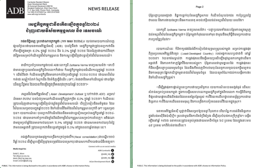យោងតាមរបាយការណ៍ចេញផ្សាយថ្ងៃនេះដោយធនាគារអភិវឌ្ឍន៍អាស៊ី (ADB) បានឱ្យដឹងថា សេដ្ឋកិច្ចកម្ពុជាត្រូវបានព្យាករថា នឹងកើនឡើងក្នុងអត្រា ៥,៨% ក្នុងឆ្នាំ ២០២៤ និង៦,០% ក្នុងឆ្នាំ ២០២៥ ដែលជំរុញដោយការរំពឹងទុក ជាវិជ្ជមានសម្រាប់កំណើនក្នុងវិស័យកម្មន្តសាល និងការស្ទុះឡើងវិញជាបន្តទៀតនៃវិស័យទេសចរណ៍។ នេះបើយោងតាមរបាយការណ៍ចេញផ្សាយថ្ងៃទី១១ ខែមេសា ឆ្នាំ២០២៤ ដោយធនាគារអភិវឌ្ឍន៍អាស៊ី (ADB)។