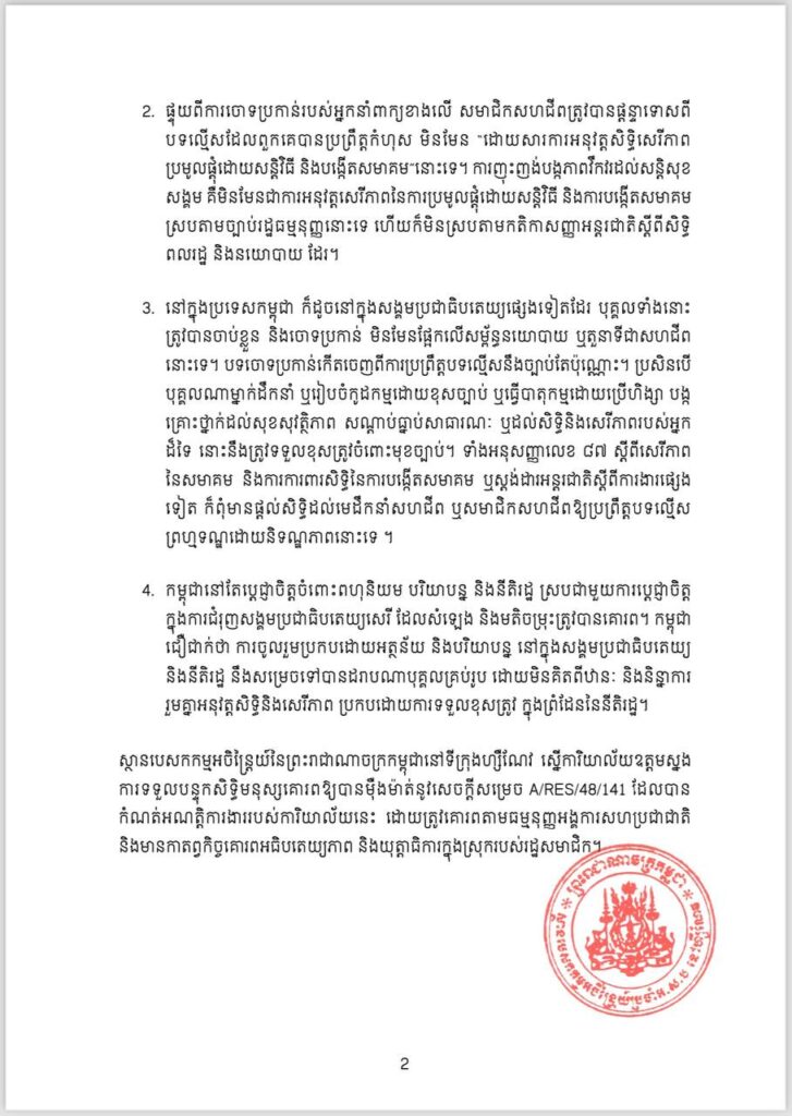 3.នៅក្នុងប្រទេសកម្ពុជា ក៏ដូចនៅក្នុងសង្គមប្រជាធិបតេយ្យផ្សេងទៀតដែរ បុគ្គលទាំងនោះត្រូវបានចាប់ខ្លួន និងចោទប្រកាន់ មិនមែនផ្អែកលើសម្ព័ន្ធនយោបាយ ឬតួនាទីជាសហជីពនោះទេ។ បទ ចោទ ប្រកាន់កើត ចេញ ពីការប្រព្រឹត្ត បទ ល្មើសនឹងច្បាប់ តែ ប៉ុណ្ណោះ។ ប្រសិនបើ បុគ្គលណាម្នាក់ដឹកនាំ ឬរៀបចំកូដកម្មដោយខុសច្បាប់ ឬធ្វើបាតុកម្មដោយប្រើហិង្សា បង្កគ្រោះថ្នាក់ដល់សុខសុវត្ថិភាព សណ្តាប់ធ្នាប់សាធារណៈ ឬដល់សិទ្ធិនិងសេរីភាពរបស់អ្នកដ៏ទៃ នោះនឹងត្រូវទទួលខុសត្រូវចំពោះមុខច្បាប់។ ទាំងអនុសញ្ញាលេខ ៨៧ ស្តីពីសេរីភាពនៃសមាគម និងការការពារសិទ្ធិនៃការបង្កើតសមាគម ឬស្តង់ដារអន្តរជាតិស្តីពីការងារផ្សេងទៀត ក៏ពុំមានផ្តល់សិទ្ធិដល់មេដឹកនាំសហជីព ឬសមាជិកសហជីពឱ្យប្រព្រឹត្តបទល្មើសព្រហ្មទណ្ឌដោយនិទណ្ឌភាពនោះទេ ។