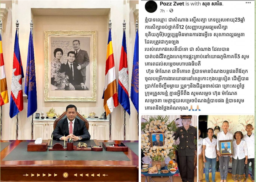 ភ្នំពេញ៖ តាមរយ:បណ្តាញសង្គមសម្តេចមហាបវរធិបតី ហ៊ុន ម៉ាណែត នាយករដ្ឋមន្ត្រីកម្ពុជា បានបញ្ជាក់ថា សម្តេចនឹងផ្តល់ក្របខ័ណ្ឌជូនដល់សាច់ញាតិបង្កើតរបស់យោធិនពលីទាំង២០នាក់ ក្នុងឧបទ្ទវហេតុផ្ទុះគ្រាប់នៅយោធភូមិភាគទី៣ កាលពីថ្ងៃទី២៧ ខែមេសា ឆ្នាំ២០២៤ (អាចជាកូន ជាចៅ ឬជាបងប្អូនបង្កើត និងអាចជាស្រី ឬជាប្រុសក៏បាន) ដើម្បីអាចបានចូលបម្រើក្នុងជួរកងទ័ពបន្តវេនពីឳពុក ឬបងប្អូនរបស់គាត់។