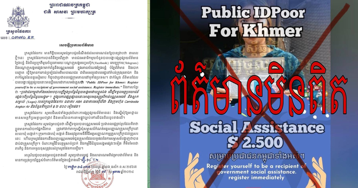 ក្រសួងផែនការបានបន្តថា ជាក់ស្តែងព័ត៌មានដែលបានបង្ហោះផ្សព្វផ្សាយនោះមានខ្លឹមសារជាភាសាអង់គ្លេសថា “Public IDPoor for Khmer: Register yourself to be a recipient of government social assistance. Register immediate.” និងភាសាខ្មែរ ថា “ប្រជាជនកម្ពុជាទាំងអស់អាចចុះបញ្ជីក្នុងប្រព័ន្ធជំនួយសង្គមដោយខ្លួនឯង ដើម្បីទទួលអត្ថប្រយោជន៍ផ្សេងៗពីប្រព័ន្ធជំនួយសង្គម”។ ក្នុងរូបភាពផ្សព្វផ្សាយនោះមានរូបមនុស្សស្រីកាន់បណ្ណសមធម៌ និងស្លាកសម្គាល់ (Logo) របស់ក្រសួងផែនការ ធនាគារ ABA ធនាគារអេស៊ីលីដា និងក្រុមហ៊ុន Cambodia Angkor Air និងចំនួនទឹកប្រាក់ $ ២ ៥០០ ទៀតផង។