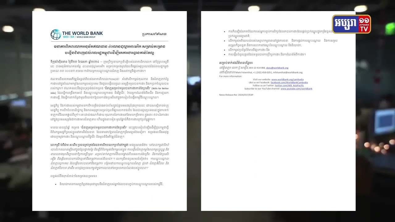 សេចក្ដីប្រកាសព័ត៌មានរបស់ធនាគារពិភពលោកថ្ងៃទី២៤ ខែឧសភា ឥណទានលើគម្រោងតម្លៃ ៤០លានដុល្លារអាមេរិក នឹងរំពឹង «ផ្តល់អត្ថប្រយោជន៍ដល់ពលរដ្ឋកម្ពុជាប្រមាណ ៣ម៉ឺន ៣ពាន់នាក់ តាមរយៈការកែលម្អការបណ្តុះបណ្តាលជំនាញ និងសេវាកម្មទីផ្សារការងារ។