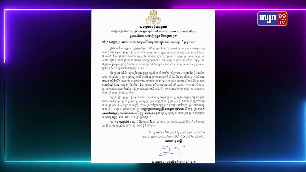 នៅក្នុងលិខិតថ្វាយព្រះពររបស់ សម្តេចមហាបវរធិបតី ហ៊ុន ម៉ាណែត នៅថ្ងៃទី១៤មិថុនានេះ បានបញ្ជាក់ថា៖ «ក្នុងឱកាសដ៏មហានក្ខត្តឫក្សឧត្តុង្គឧត្តម នៃព្រះរាជពិធីបុណ្យចម្រើនព្រះជន្មគម្រប់ ៨៨ព្រះវស្សាយាងចូល ៨៩ព្រះវស្សា របស់ហ្លួងម៉ែជាអម្ចាស់ ទូលព្រះបង្គំជាខ្ញុំ និងភរិយា សូមព្រះបរមរាជានុញ្ញាតក្រាបបង្គំថ្វាយព្រះសព្ទសាធុការពរ សិរីវឌ្ឍនា ជយាមង្គល វិបុលសុខ បវរមហាប្រសើរ។