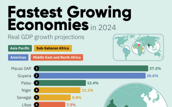 ដោយកំណើននេះស្ថិតក្នុងអត្រា ៦,១%។ សន្ទុះនេះ ឈរនៅខ្ពស់ជាងហ្វីលីពីន និងវៀតណាម ដែលមានកំណើនសេដ្ឋកិច្ចត្រឹម ៥,៩% ដូចគ្នា។ ទីក្រុងរដ្ឋបាលស្វយ័តពិសេសរបស់ចិន ម៉ាកាវ ត្រូវបានព្យាករថានឹងមានកំណើនសេដ្ឋកិច្ចខ្ពស់ជាងគេក្នុងពិភពលោក ដោយអត្រាកំណើនមានរហូតដល់ ២៧,២% ខណៈអត្រាកំណើនសេដ្ឋកិច្ចជាមធ្យមរបស់ពិភពលោកស្ថិតត្រឹម ២,៩% ប៉ុណ្ណោះ- Visual Capitalist