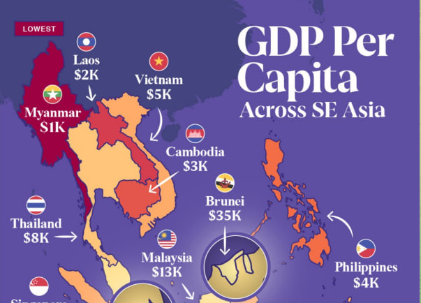 ឈរនៅលេខរៀងបន្ទាប់គឺ ប្រ៊ុយណេ ដែលមាន GDP Per Capita សរុប ៣៥ ១១០ដុល្លារ ហើយសេដ្ឋកិច្ចរបស់ប្រទេសនេះពឹងផ្អែកយ៉ាងខ្លាំងទៅលើប្រេង។ ម៉ាឡេស៊ី និងថៃ ឈរលេខ៣ និងលេខ៤ ដោយមាន GDP Per Capita សរុប ១៣ ៣១០ដុល្លារ និង៧ ៨១០ដុល្លារ ហើយសេដ្ឋកិច្ចពឹងផ្អែកទៅលើវិស័យទេសចរណ៍ – Visual Capitalist
