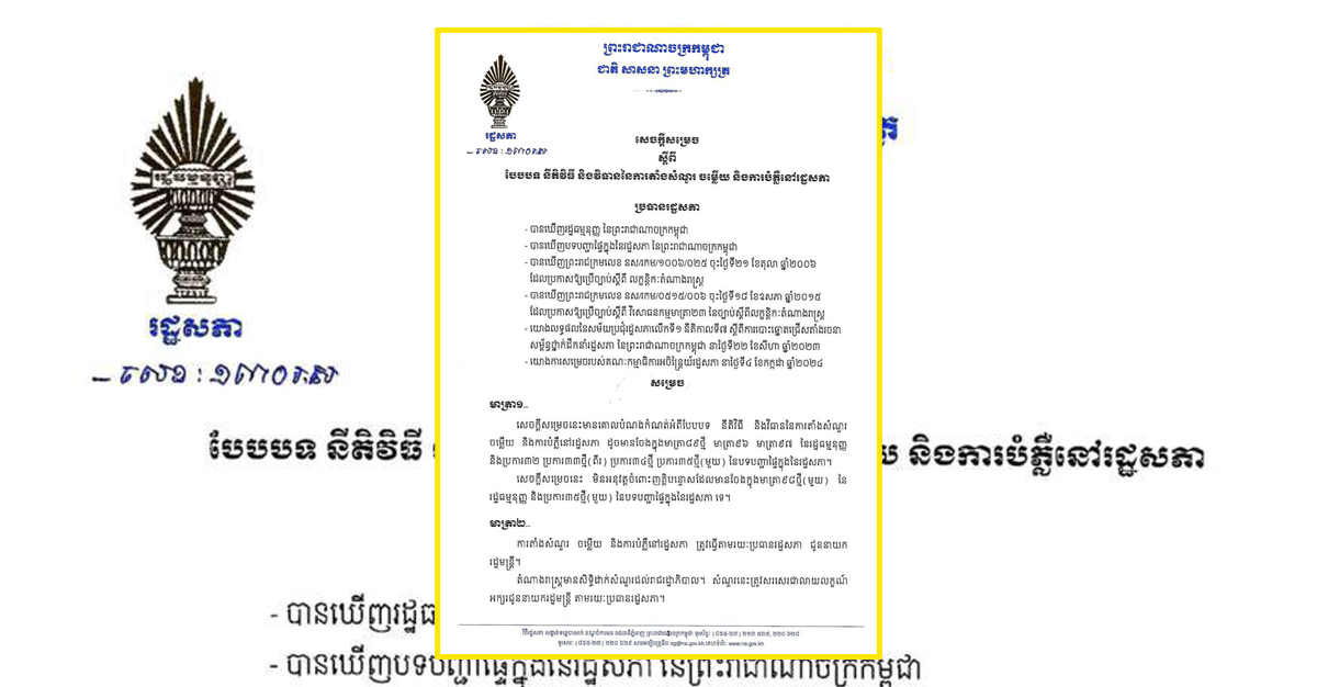 ភ្នំពេញ៖សម្តេចមហារដ្ឋសភាធិការធិបតី យួន សុដារី ប្រធានរដ្ឋសភា នៃព្រះរាជាណាចក្រកម្ពុជា កាលពីថ្ងៃទី៤ ខែកក្កដា ឆ្នាំ២០២៤ បានចេញសេចក្តីសម្រេចស្តីពីបែបបទ នីតិវិធី និងវិធាននៃការតាំងសំណួរ ចម្លើយ និងការបំភ្លឺនៅរដ្ឋសភា។