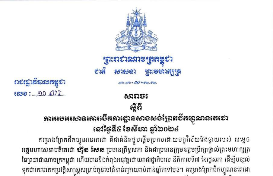 (ភ្នំពេញ)៖ នៅថ្ងៃទី៥ ខែសីហា ឆ្នាំ២០២៤ វេលាម៉ោង ៩ និង ០៩នាទីព្រឹក ត្រូវគោះជួង និងទូងស្គរព្រមៗគ្នា ដើម្បីអបអរសាទរ ពិធីបើកការដ្ឋាន ”ព្រែកជីកហ្វូណនតេជោ” ។ នេះបើតាមសារាចររាជរដ្ឋាភិបាលកម្ពុជា ស្តីពី ការអបអរសាទរ ការបើកការដ្ឋានសាងសង់ ព្រែកជីកហ្វូណនតេជោ នៅថ្ងៃទី៥ ខែសីហា ឆ្នាំ២០២៤ ដែលទទួលបាននៅល្ងាចថ្ងៃទី០៥ ខែកក្កដា ឆ្នាំ២០២៤ ។
