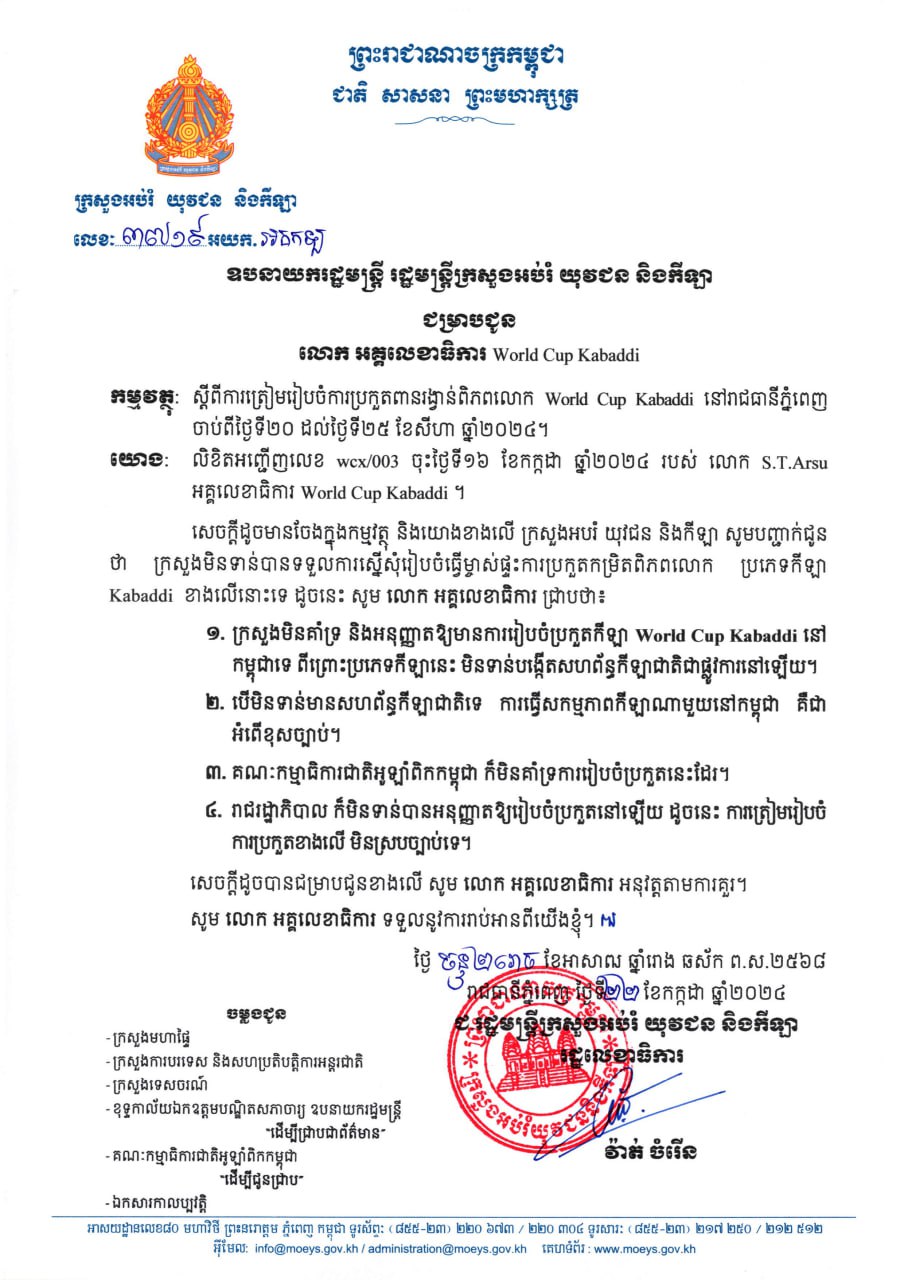 ក្រសួងអប់រំ យុវជន និងកីឡា មិនអនុញ្ញាតឱ្យរៀបចំការប្រកួតពានរង្វាន់ពិភពលោក World Cup KABADDI នៅរាជធានីភ្នំពេញ ចាប់ពីថ្ងៃទី ២០-២៥ ខែសីហា ឆ្នាំ២០២៤