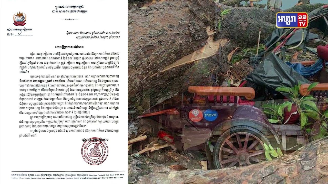 ដើមឈើចំណាស់ នៃសម័យបុរាណមួយដើម ក្នុងបរិវេណអង្គរធំ នៃខេត្តសៀមរាប បានបាក់រលំដោយសារខ្យល់កន្ត្រាក់ បណ្តាលឱ្យមនុស្សម្នាក់ស្លាប់ និងបីនាក់រងរបួស។
