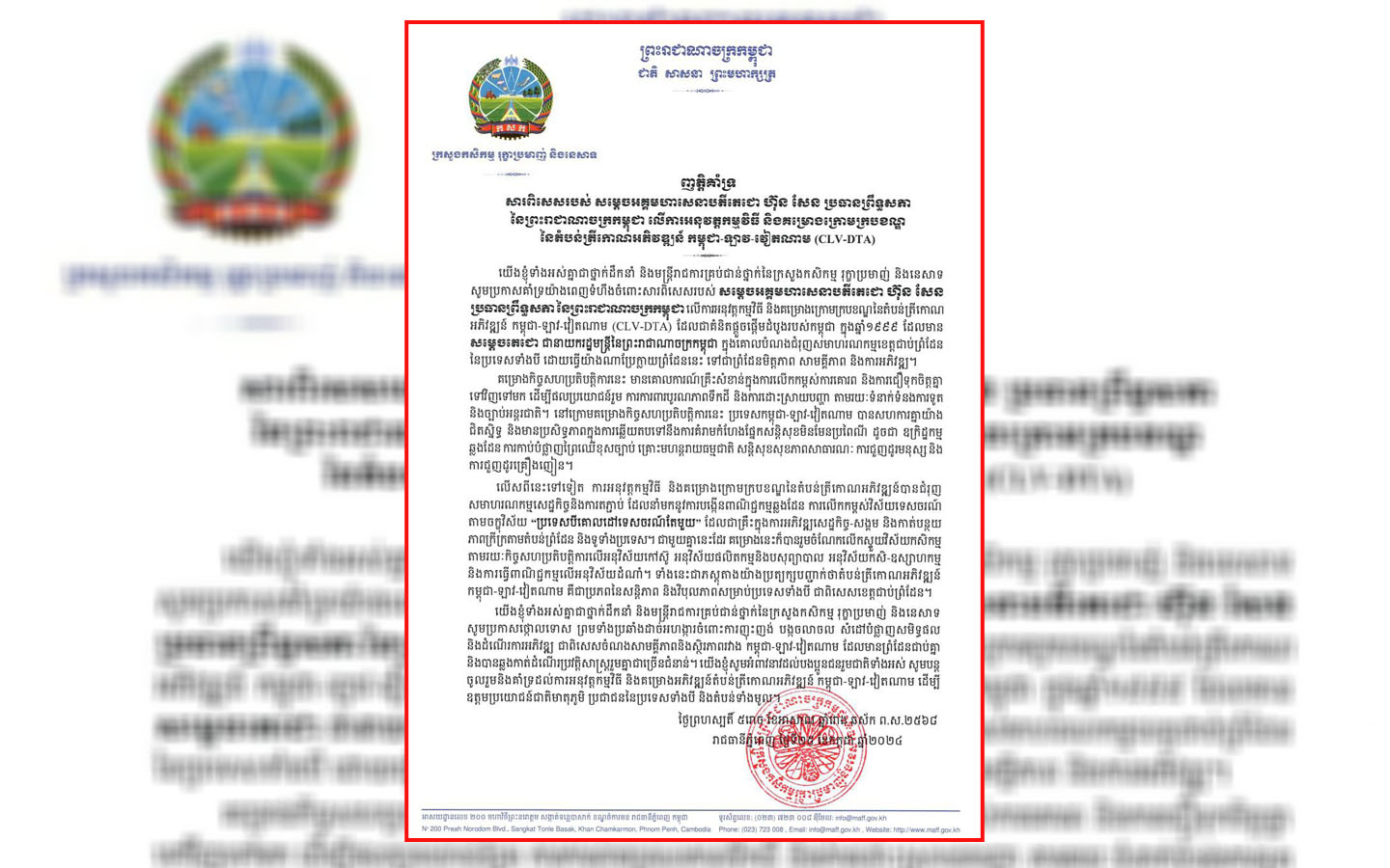(ភ្នំពេញ)៖ ថ្នាក់ដឹកនាំ និងមន្ដ្រីរាជការគ្រប់ជាន់ថ្នាក់នៃក្រសួងកសិកម្ម រុក្ខាប្រមាញ់ និងនេសាទបានចេញញត្តិគាំទ្រ ចំពោះសារពិសេសរបស់សម្ដេចអគ្គមហាសេនាធិបតីតេជោ ហ៊ុន សែន ប្រធានព្រឹទ្ធសភានៃព្រះរាជាណាចក្រកម្ពុជា លើការអនុវត្តកម្មវិធី និងគម្រោងក្រោមក្របខណ្ឌនៃតំបន់ត្រីកោណអភិវឌ្ឍ កម្ពុជា-ឡាវ-វៀតណាម (CLV-DTA)។