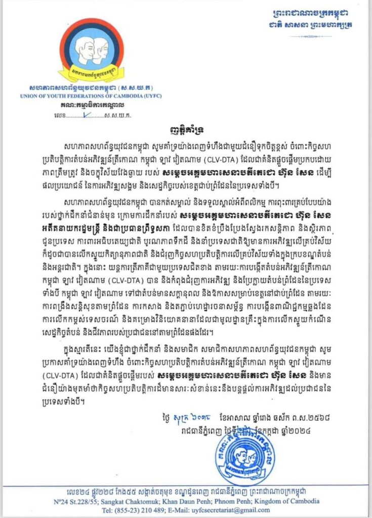 សហភាពសហព័ន្ធយុវជនកម្ពុជា សូមគាំទ្រយ៉ាងពេញទំហឹងជាមួយជំនឿទុកចិត្តខ្ពស់ ចំពោះកិច្ចសហប្រតិបត្តិការតំបន់អភិវឌ្ឍន៍ត្រីកោណ