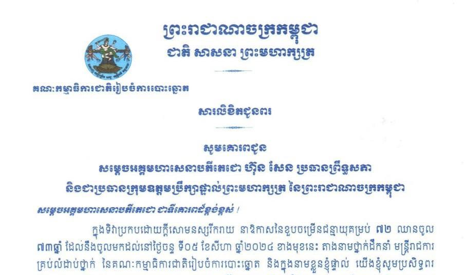 គណៈកម្មាធិការជាតិរៀបចំការបោះឆ្នោត ផ្ញើសារលិខិតជូនពរ សម្តេចអគ្គមហាសេនាបតីតេជោ ហ៊ុន សែន ប្រធានព្រឹទ្ធសភា និងជាប្រធានក្រុមឧត្ដមប្រឹក្សាផ្ទាល់ព្រះមហាក្សត្រ នៃព្រះរាជាណាចក្រកម្ពុជា ក្នុងទិវាប្រកបដោយក្តីសោមនស្សរីករាយ នាឱកាសនៃខួបចម្រើនជន្មាយុគម្រប់ ៧២ ឈានចូល ៧៣ឆ្នាំ