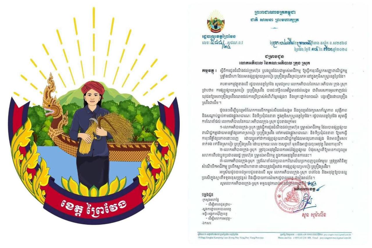 ក្នុងសេចក្តីជូនដំណឹងចុះថ្ងៃទី៨ ខែសីហា ឆ្នាំ២០២៤ រដ្ឋបាលខេត្តព្រៃវែងបានលើកឡើងថា ការផ្សព្វផ្សាយស្រាបៀរ ឬគ្រឿងស្រវឹង បានជះឥទ្ធិពលអវិជ្ជមានដល់សង្គម ជាពិសេសអូសទាញដល់យុវជនឱ្យសេពគ្រឿងស្រវឹងឈានដល់ការប្រើប្រាស់អំពើហិង្សាផ្សេងៗ និងគ្រោះថ្នាក់ចរាចរណ៍។ដូចនេះដើម្បីចូលរួមចំណែកការលើកកម្ពស់សីលធម៌សង្គម និងចូលរួមថែរក្សាសោភណភាព សុវត្ថិភាព និងសណ្តាប់ធ្នាប់តាមដងផ្លូវសាធារណៈ និងទីប្រជុំជននានា ក្នុងភូមិសាស្ត្រខេត្តព្រៃវែងរដ្ឋបាលខេត្តសូមធ្វើការណែនាំដល់ លោកអភិបាលនៃគណៈអភិបាលក្រុង-ស្រុក ដូចខាងក្រោម៖