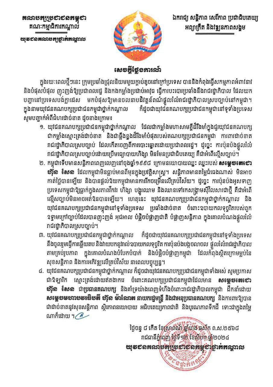 សេចក្តីថ្លែងការណ៍របស់យុវជនគណបក្សប្រជាជនកម្ពុជា វាយបកក្រុមជ្រុលនិយមមួយក្តាប់តូចនៅក្រៅប្រទេស