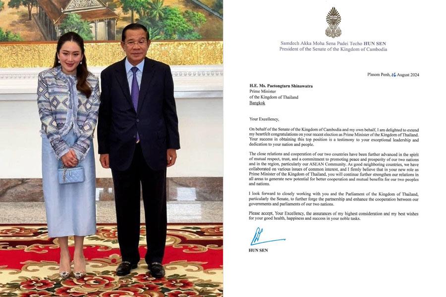 (ភ្នំពេញ)៖ សម្ដេចអគ្គមហាសេនាបតីតេជោ ហ៊ុន សែន ប្រធានព្រឹទ្ធសភា កម្ពុជា ផ្ញើសារលិខិតអបអរសាទរជូន លោកជំទាវ ផែថងថាន ស៊ីណាវ៉ាត្រា (Paetongtarn Shinawatra) ដែលត្រូវបានជាប់ឆ្នោតជានាយករដ្ឋមន្ត្រី នៃព្រះរាជាណាចក្រថៃ ។ នេះបើយោងតាមសារលិខិតអបអរសាទររបស់ សម្ដេចតេជោ ហ៊ុន សែន ប្រធានព្រឹទ្ធសភាកម្ពុជា ដែលទទួលបាន នៅរសៀលថ្ងៃទី១៦ ខែសីហា ឆ្នាំ២០២៤ ។