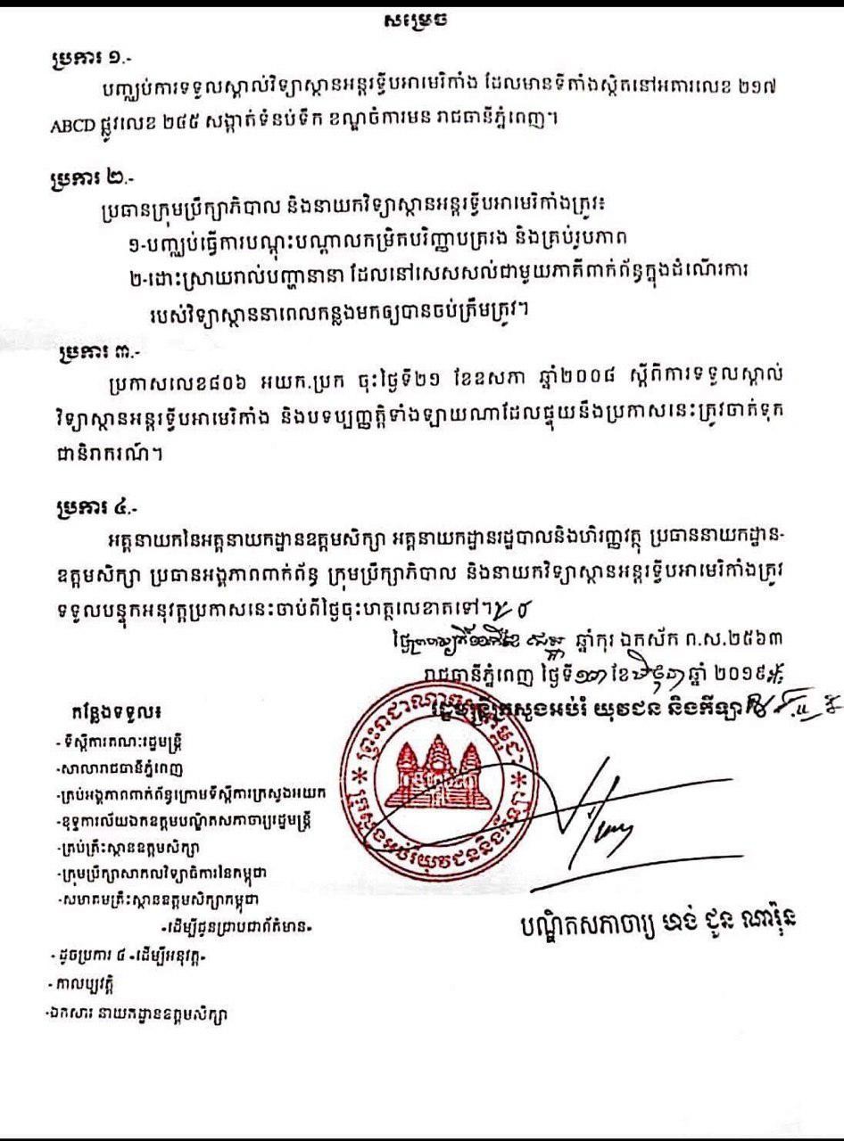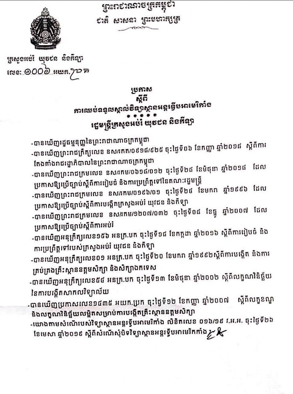 ក្រសួងអប់រំ សម្រេចឈប់ទទួលស្គាល់វិទ្យាស្ថានអន្តរទ្វីបអាម៉េរិកាំង តាមសំណើរបស់វិទ្យាស្ថានអន្តរទ្វីបអាម៉េរិកាំង