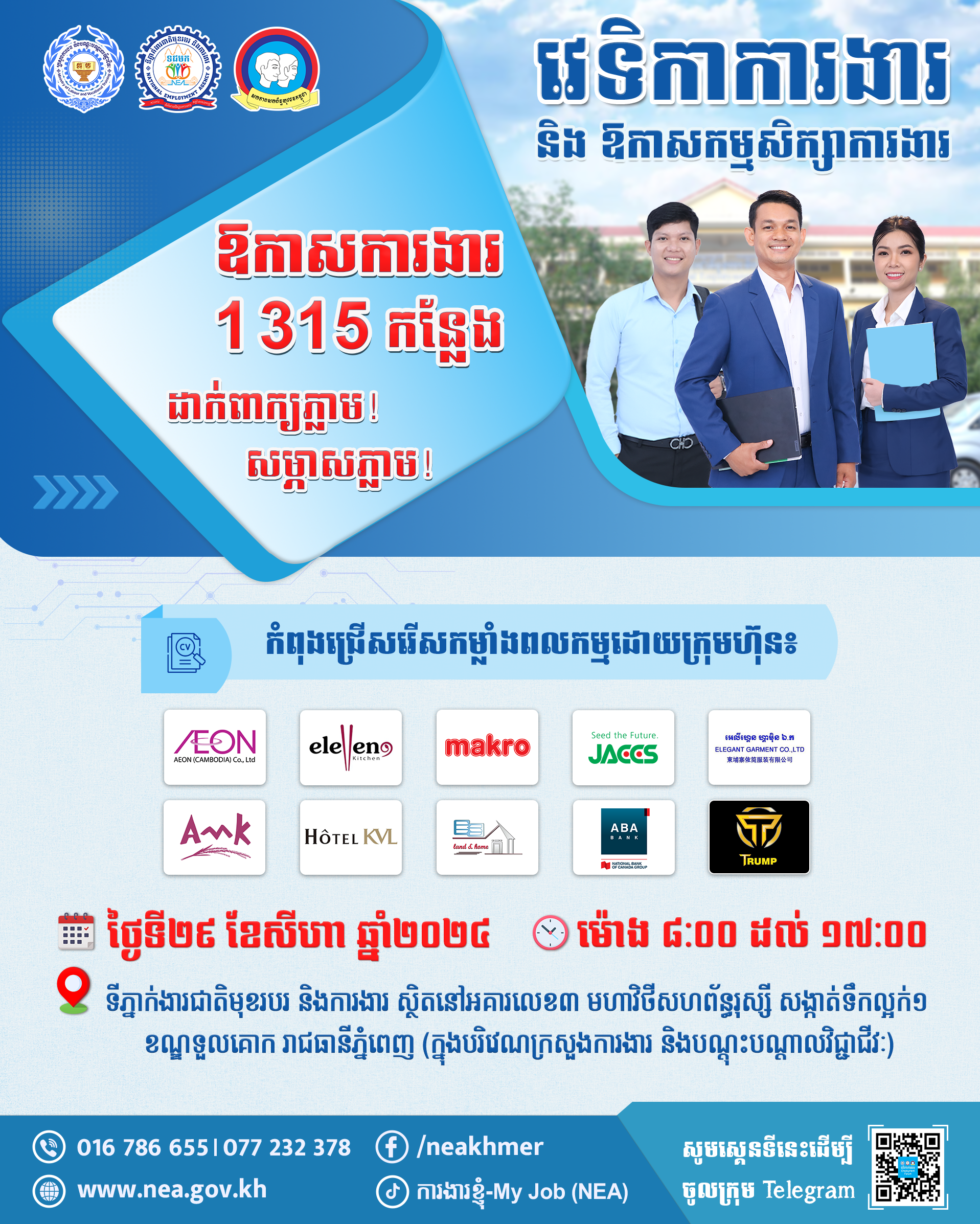 (ភ្នំពេញ)៖ ឱកាសការងារថ្មីបន្ថែមទៀតសរុប ១៣១៥ កន្លែង នឹងត្រូវផ្តល់ជូនយុវជន សិស្ស/និស្សិត និងអ្នកស្វែងរកការងារនៅក្នុងវេទិកាការងារ និងកម្មសិក្សាការងារ ដែលរៀបចំដោយទីភ្នាក់ងារជាតិមុខរបរ និងការងារ (NEA) នៃក្រសួងការងារ និងបណ្តុះបណ្តាលវិជ្ជាជីវៈ សហការជាមួយ ស.ស.យ.ក. វិស័យការងារ សន្តិសុខសង្គម និងបណ្តុះបណ្តាលវិជ្ជាជីវៈ នាថ្ងៃប្រពហស្បតិ៍ ទី២៩ ខែសីហា ឆ្នាំ២០២៤ ខាងមុខនេះ។