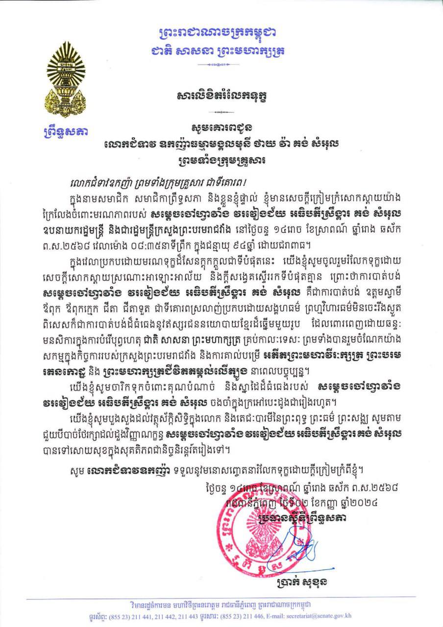 ភ្នំពេញ៖ ក្នុងនាមសមាជិក សមាជិកាព្រឹទ្ធសភា និងខ្លួនខ្ញុំផ្ទាល់ ខ្ញុំមានសេចក្តីក្រៀមក្រំសោកស្តាយយ៉ាង ក្រៃលែងចំពោះមរណភាពរបស់ សម្តេចចៅហ្វាវាំង វរវៀងជ័យ អធិបតីស្រឹង្គារ គង់ សំអុល ឧបនាយករដ្ឋមន្ត្រី និងជារដ្ឋមន្ត្រីក្រសួងព្រះបរមរាជវាំង នៅថ្ងៃចន្ទ ១៤រោច ខែស្រាពណ៍ ឆ្នាំរោង ឆស័ក ព.ស.២៥៦៨ វេលាម៉ោង ០៨:៣៥នាទីព្រឹក ក្នុងជន្មាយុ ៩៤ឆ្នាំ ដោយជរាពាធ។ ក្នុងវេលាប្រកបដោយមរណទុក្ខដ៏សែនក្ដុកក្ដួលជាទីបំផុតនេះ យើងខ្ញុំសូមចូលរួមរំលែកទុក្ខដោយសេចក្តីសោកស្តាយស្រណោះអាឡោះអាល័យ និងក្តីសង្វេគស្ទើររកទីបំផុតគ្មាន ព្រោះថាការបាត់បង់ ។