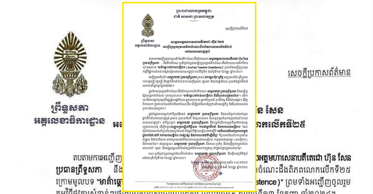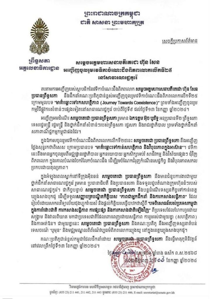 គណៈប្រតិភូជាន់ខ្ពស់កម្ពុជាដែលដឹកនាំដោយ សម្តេចគេជា ប្រធានព្រឹទ្ធសភា នឹងធ្វើមាតុភូមិនិវត្តន៍ នៅវេលាព្រឹកថ្ងៃទី១៣ ខែកញ្ញា ឆ្នាំ២០២៤៕