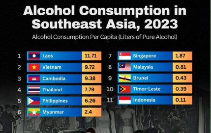 ខណៈវៀតណាមតាមពីក្រោយយ៉ាងប្រកៀកដោយពលរដ្ឋម្នាក់ជាមធ្យម ប្រើគ្រឿងស្រវឹង ៩,៧២លីត្រក្នុងមួយឆ្នាំ។ កម្ពុជាស្ថិតក្នុងលំដាប់ទី៣ ក្នុងតំបន់ដោយពលរដ្ឋទទួលទានគ្រឿងស្រវឹងជាមធ្យម ៩,៣៨លីត្រក្នុងមួយឆ្នាំ។ ថៃ ដែលត្រូវបានគេស្គាល់ថាជាកន្លែងកម្សាន្តពេលរាត្រី និងជាគោលដៅទេសចរណ៍ដ៏មមាញឹក ជាប់ចំណាត់ថ្នាក់ទី ៤ ជាមួយនឹងការប្រើប្រាស់ជាមធ្យម ៧,៧៩ លីត្រក្នុងមនុស្សម្នាក់ – Seasia