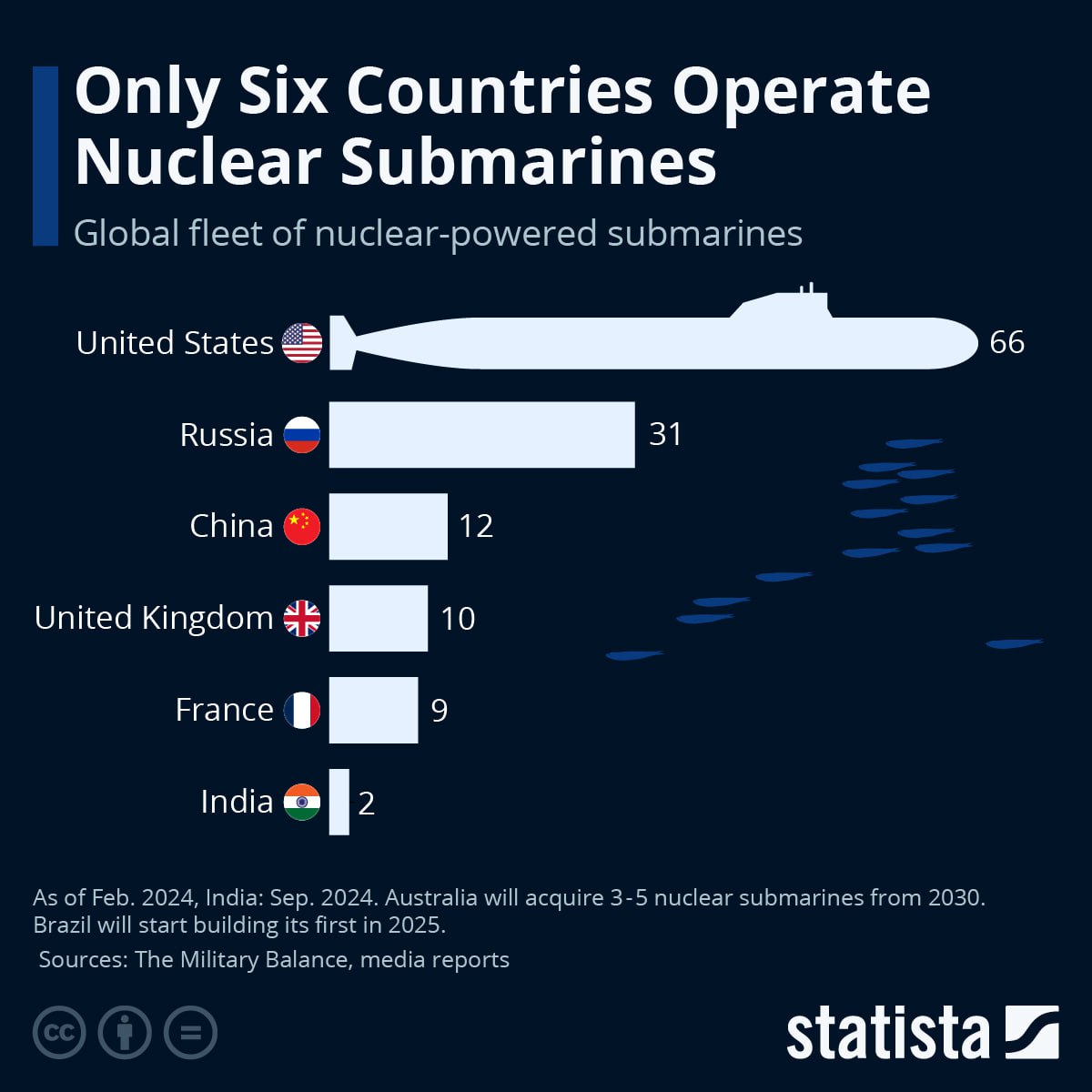 ក្នុងនោះ មហាអំណាចអាមេរិក មាននាវាមុជទឹកនុយក្លេអ៊ែរដល់ទៅ ៦៦គ្រឿង ខណៈរុស្ស៊ី មាននាវាមុជទឹកនុយក្លេអ៊ែរ ៣១គ្រឿង។ ក្រៅពីនេះ មានប្រទេសចិន មាននាវាចំនួន ១២គ្រឿង អង់គ្លេស មាន ១០គ្រឿង បារាំង មាន ៩គ្រឿង និងឥណ្ឌាមាន ២គ្រឿង