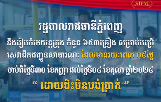 សម្រាប់បម្រើសេវាដឹកជញ្ជូនបងប្អូនប្រជាពលរដ្ឋទាំងអស់ ដោយមិនគិតកម្រៃ ចាប់ពីថ្ងៃទី៣០ កញ្ញា – ថ្ងៃទី០៤ តុលា ២០២៤។