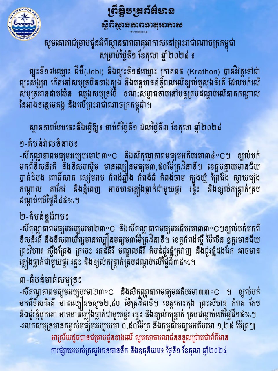 ភ្នំពេញ៖ក្រសួងធនធានទឹកនិងឧតុនិយមជូនដំណឹងអំពីស្ថានភាពធាតុអាកាសនៅព្រះរាជាណាចក្រកម្ពុជាសម្រាប់ថ្ងៃទី១ខែតុលា ឆ្នាំ២០២៤៖ព្យុះទី១៧ឈ្មោះ ជីប៊ី(Jebi) និងព្យុះទី១៨ឈ្មោះ ក្រាតធន (Krathon) បានវិវត្តទៅជាព្យុះសង្ឃរា កើតនៅសមុទ្រចិនខាងត្បូង និងបន្តមានឥទ្ធិពលលើខ្យល់មូសុងនិរតី ដែលបក់លើសមុទ្រអានដាមម៉ែន(Andaman Sea) ឈូងសមុទ្រថៃ ខណៈសម្ពាធទាបនៅបន្តគ្របដណ្ដប់លើភាគកណ្តាលនៃអាងទន្លេមេគង្គ និងលើព្រះរាជាណាចក្រកម្ពុជា។