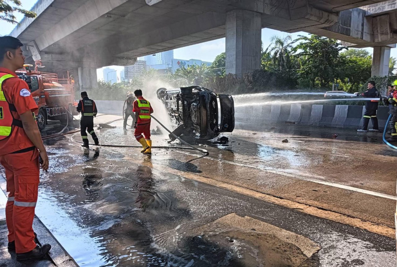 Bangkok Post បានរៀបរាប់ថា ឡានតាក់ស៊ីមួយគ្រឿងនេះ បានឆាបឆេះនៅផ្លូវ Rama IX កាលពីព្រឹកថ្ងៃសៅរ៍ ដែលបានបណ្តាលឲ្យរងរបួស ទាំងអ្នកដំណើរ និងអ្នកបើកបរ។ ភ្លើងបានឆាបឆេះ នៅម៉ោង៨និង១០នាទីព្រឹក ហើយប្រើពេល១៥នាទី ទើបរលត់ទៅវិញ។ តាមការសន្និដ្ឋានបឋមអំពីមូលហេតុនៃការឆេះ គឺបណ្តាលមកពីគ្រោះថ្នាក់ ក្នុងនោះ រថយន្តតាក់ស៊ីមួយគ្រឿងនេះ បានបើកទៅបុករបាំងថ្ម នៅចំណុចផ្លូវកោង ហើយក្រឡាប់ផ្ងារជើង។