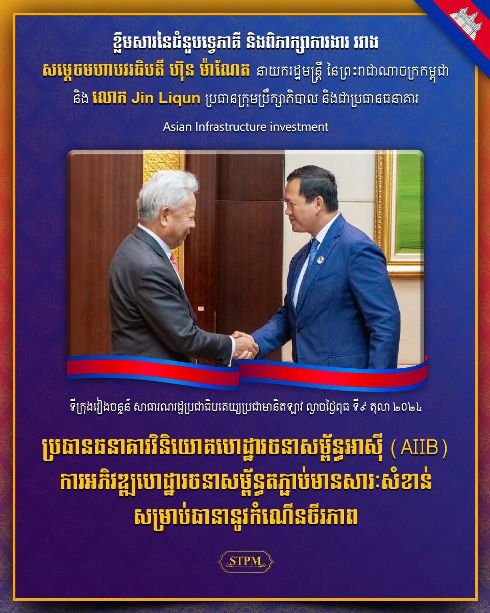 លោកប្រធានធនាគារបានគោរពជម្រាបជូន សម្ដេចធិបតី ថា កម្ពុជា ជាប្រទេសស្ថាបនិកមួយដែលបានចូលរួមចំណែកក្នុងការបង្កើតធនាគារ AIIB កាលពី ៩ ឆ្នាំមុន។ ការណ៍នេះ សបញ្ជាក់អំពីកិច្ចសហប្រតិបត្តិការដ៏ល្អប្រសើរ និងការរួមចំណែកដ៏សំខាន់របស់កម្ពុជាក្នុងការអភិវឌ្ឍបន្តិចម្ដងៗនៃដំណើរការរបស់ធនាគារ AIIB។