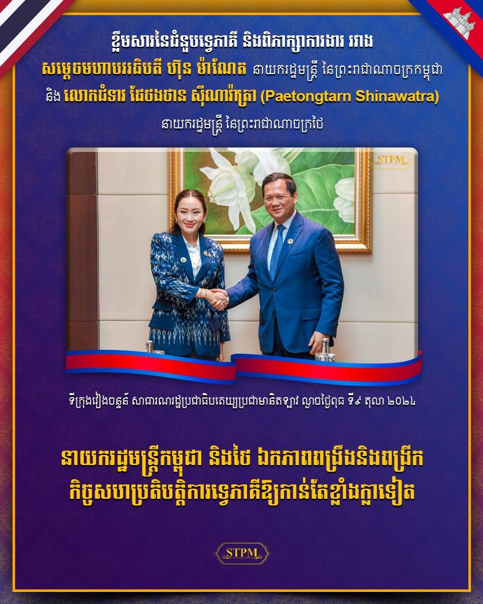 ឡាវ៖ ក្នុងជំនួបពិភាក្សាទ្វេភាគី នាល្ងាចថ្ងៃទី៩ ខែតុលា ឆ្នាំ២០២៤ សម្តេចមហាបវរធិបតី ហ៊ុន ម៉ាណែត នាយករដ្ឋមន្ត្រី នៃព្រះរាជាណាចក្រកម្ពុជា និងលោកជំទាវ ផេថងថាន ស៊ីណាវ៉ាត់ត្រា នាយករដ្ឋមន្ត្រីនៃព្រះរាជាណាចក្រថៃ បានឯកភាពគ្នា បន្តពង្រឹងនិងពង្រីកកិច្ចសហប្រតិបត្តិការទ្វេភាគីឱ្យកាន់តែខ្លាំងក្លាទៀត ។