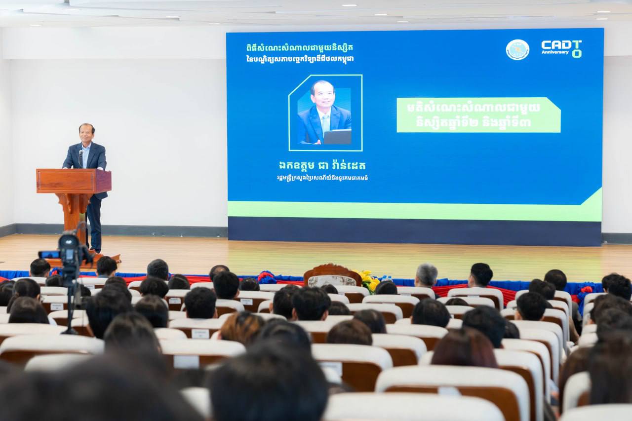 ប្រសាសន៍ ឯកឧត្តម ជា វ៉ាន់ដេត រដ្ឋមន្រ្តីក្រសួងប្រៃសណីយ៍ និងទូរគមនាគមន៍ បញ្ជាក់កាលពីថ្ងៃទី៨ តុលា ឆ្នាំ២០២៤ អញ្ជើញជួបសំណេះសំណាលសួរសុខទុក្ខនិស្សិត ដែលកំពុងសិក្សានៅបណ្ឌិត្យសភាបច្ចេកវិទ្យាឌីជីថលកម្ពុជា (CADT) សរុបប្រមាណ ៥២០នាក់ នៅ CADT។