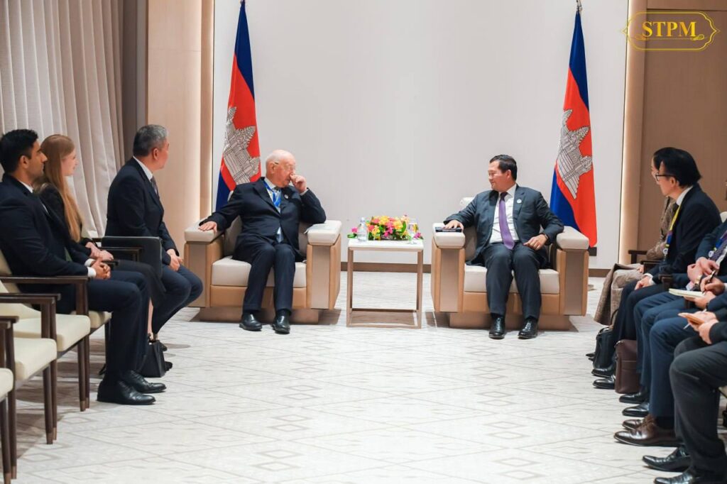 ឡាវ៖ សម្តេចមហាបវរធិបតី ហ៊ុន ម៉ាណែត នាយករដ្ឋមន្ត្រី នៃព្រះរាជាណាចក្រកម្ពុជា បានអនុញ្ញាតឱ្យលោកសាស្ត្រាចារ្យ Klaus Schwab ស្ថាបនិក និងជាប្រធានប្រតិបត្តិ នៃវេទិកាសេដ្ឋកិច្ចពិភពលោក (WEF) ចូលជួបសម្តែងការគួរសម ក្នុងឱកាសនៃការចូលរួមកិច្ចប្រជុំកំពូលអាស៊ាន លើកទី៤៤ និង ៤៥ និងកិច្ចប្រជុំកំពូលពាក់ព័ន្ធ ពីថ្ងៃទី៩ ដល់ថ្ងៃទី ១១ ខែតុលា ឆ្នាំ២០២៤ នៅរដ្ឋធានីវៀងចន្ទន៍ នៃសាធារណរដ្ឋប្រជាធិបតេយ្យប្រជាមានិតឡាវ នាល្ងាចថ្ងៃទី១០ ខែតុលា ឆ្នាំ២០២៤ ។