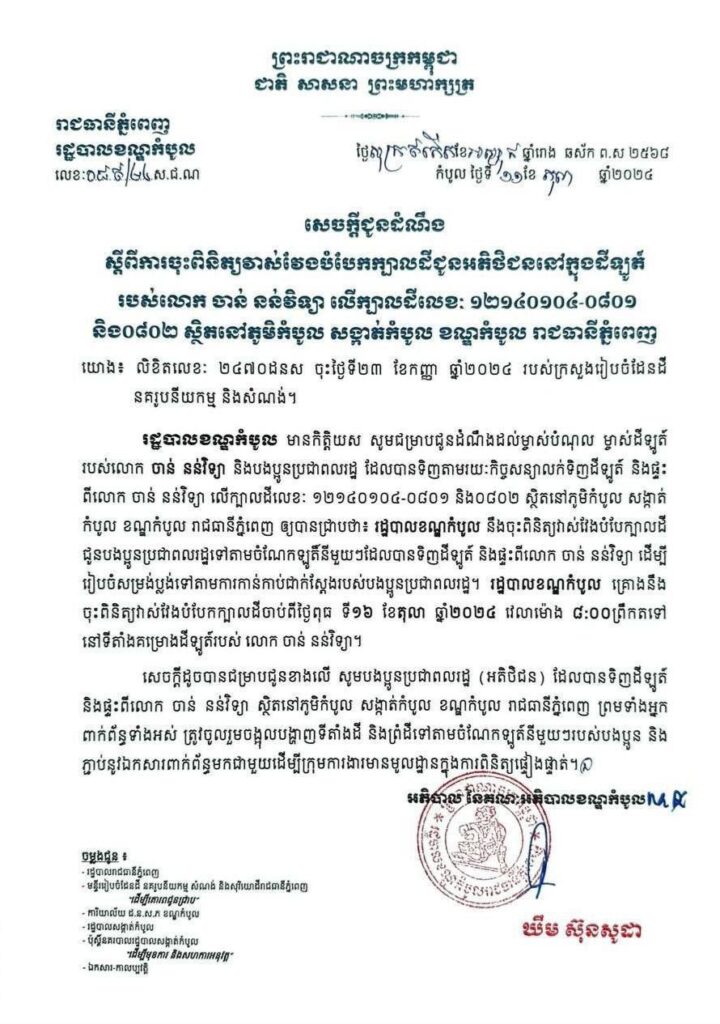 របស់លោក ចាន់ នន់វិទ្យា លើក្បាលដីលេខៈ ១២១៤០១០៤-០៨០១ និង០៨០២ ស្ថិតនៅភូមិកំបូល សង្កាត់កំបូល ខណ្ឌកំបូល រាជធានីភ្នំពេញ នៅថ្ងៃទី១៦ ខែតុលា ឆ្នាំ២០២៤ វេលាម៉ោង ៨៖០០នាទីព្រឹក។