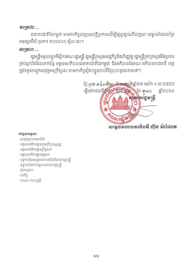 រាជរដ្ឋាភិបាល ចេញអនុក្រឹត្យអនុញ្ញាតឲ្យប្រើប្រាស់ ក្រដាសប្រាក់ប្រភេទថ្មី ២សែនរៀល ទូទាំងប្រទេស