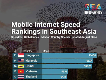 ជាល្បឿនដែលលឿនបំផុតក្នុងអាស៊ីអាគ្នេយ៍ និងជាប់ចំណាត់ថ្នាក់ទី ១១នៅទូទាំងពិភពលោក។ ប្រទេសម៉ាឡេស៊ី និងប្រ៊ុយណេ តាមពីក្រោយ ដោយជាប់ចំណាត់ថ្នាក់ទី ១៤ និងទី ១៦ ជាមួយនឹងល្បឿនលើសពី ១០០ Mbps – SEA Infographics
