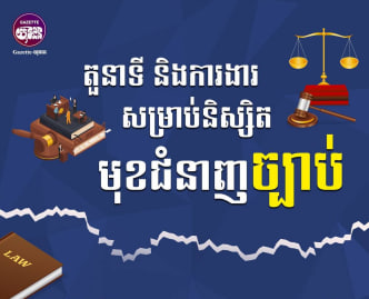 តួនាទី និងការងារសម្រាប់និស្សិតមុខជំនាញ ច្បាប់One-Minuteអត្ថបទដោយ៖ឆាយ រត្ថា ប្រភព៖ Gazetteយុវជន #ams1minute ឆាយ រត្ថាលោក ឆាយ រត្ថា ជាបុគ្គលិកផ្នែកព័ត៌មានវិទ្យា នៃអគ្គនាយកដ្ឋានវិទ្យុ និងទូរទស្សន៍ អប្សរាអត្ថបទមុនអត្ថបទបន្ទាប់