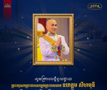 ព្រះបាទសម្តេចព្រះបរមនាថ នរោត្តម សីហមុនី ព្រះមហាក្សត្រនៃព្រះរាជាណាចក្រកម្ពុជា ជាទីគោរពសក្ការៈដ៏ខ្ពង់ខ្ពស់បំផុត សូមមានព្រះរាជសុខភាពល្អបរិបូរណ៍ ព្រះកាយពលមាំមួន ព្រះបញ្ញាវាងវៃ និងព្រះជន្មាយុយឺនយូរ ដើម្បីគង់ប្រថាប់ជាម្លប់ដ៏ត្រជាក់ត្រជុំ សម្រាប់ប្រជានុរាស្ត្រខ្មែរយូរអង្វែងតរៀងទៅ